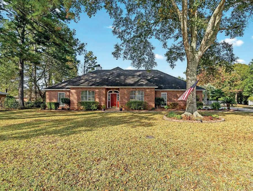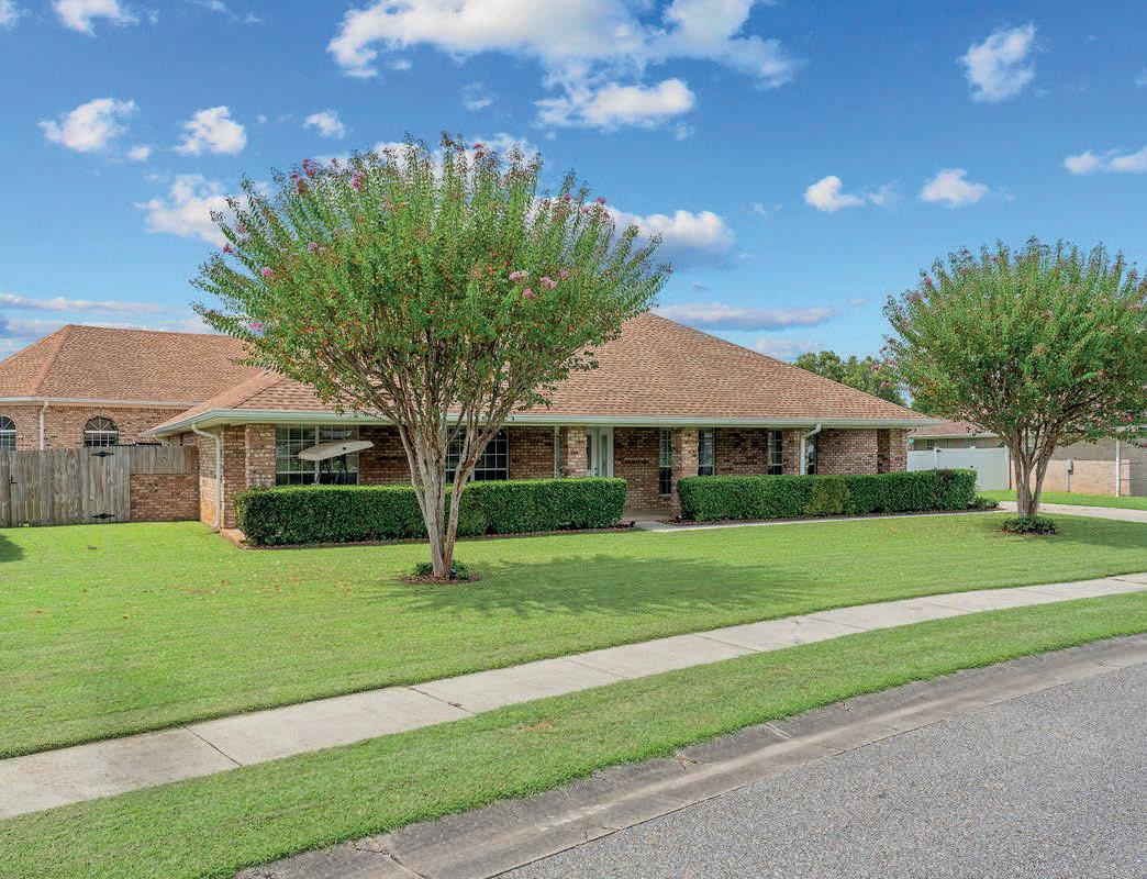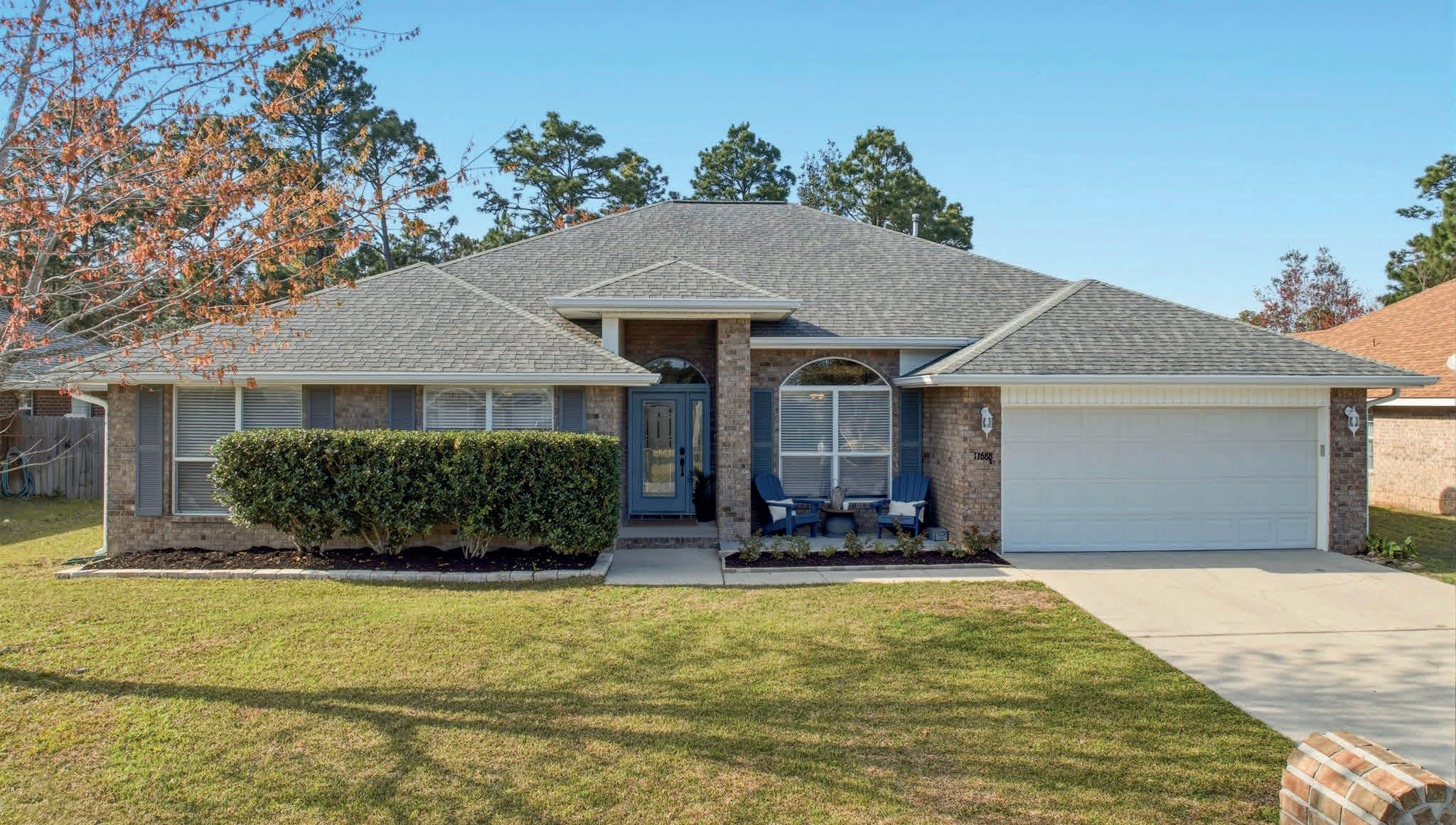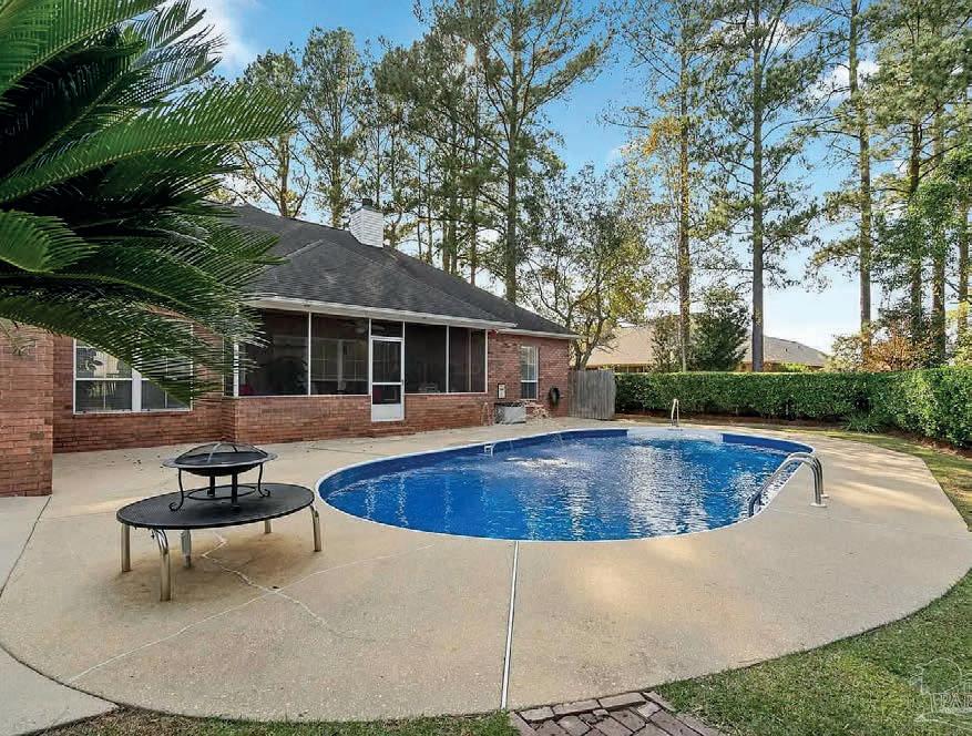 Beautiful all-brick 4 beds, 3 baths home in the desirable Manchester subdivision, known for wide streets, tidy yards, and a peaceful setting. Inside, an open floor plan with soaring ceilings creates a bright, welcoming feel. The great room with wood-burning fireplace flows into the kitchen, perfect for gatherings or relaxing nights in. The kitchen features granite countertops, bar-top island with wood surface, gas cooktop, abundant cabinetry, walk-in pantry, built-in desk, and breakfast nook overlooking the backyard. The primary suite offers a doubletiered ceiling, granite double vanities, garden tub, separate shower, and two walk-in closets. Formal dining room can also be used as office, playroom, or sitting area. Enjoy a private backyard backing to greenbelt, custom front porch, and insulated sunroom with epoxy flooring. Yard includes garden area, privacy fence, sprinkler system, and air-conditioned studio building—ideal for office, gym, or hobby space. Minutes from Perdido Key beaches, Pensacola, shopping, and dining. VA assumable.