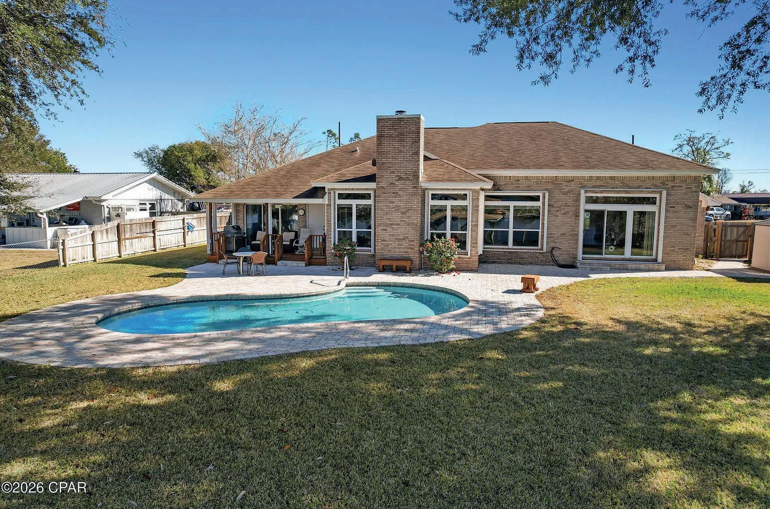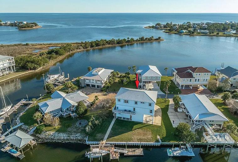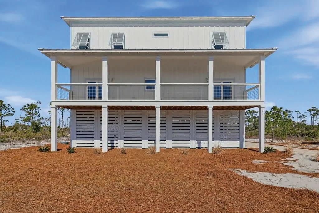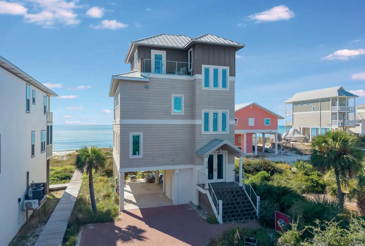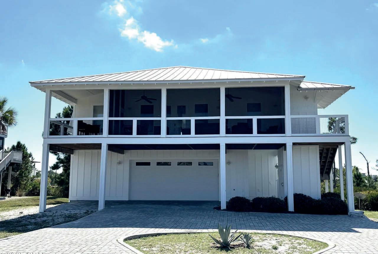 Welcome to 170 Gulf Pines Dr in Port St. Joe, FL, an exceptional coastal home offering relaxed Gulf living just steps from the sugar-white sands of the Gulf of America. This beautifully maintained residence features 5 bedrooms, 4 full bathrooms, and 2 half bath across 2,677 square feet of living space, making it ideal as a primary residence, second home, or vacation rental investment. The home's striking coastal exterior, durable metal roof, and elevated design are showcased in the photos and drone footage. Expansive covered porches provide inviting spaces to enjoy Gulf breezes, morning coffee, and evening sunsets, with peaceful views of the surrounding neighborhood and glimpses of the water. Inside, the spacious layout is designed for comfort and functionality, offering ample room for family and guests. The elevated construction enhances natural light and airflow, while the generous bedroom and bathroom configuration provides privacy and flexibility for entertaining. A large custom "Container Store" pantry gives one more ease of daily needs. The exceptional front-yard outdoor living area, thoughtfully designed into a private, resort-style oasis. The screened-in pool enclosure creates an open, airy atmosphere while providing shade and comfort, allowing the pool to be enjoyed year-round. Surrounding deck space offers plenty of room for lounging or entertaining. Beneath the home, a ground-level screened-in living/entertainment area provides a shaded, breezy retreat ideal for outdoor dining, relaxing, or gathering with friends and family after a day at the beach. Easy access to the pool and front yard enhances the home's seamless indoor-outdoor flow. Add'l features include a garage, ground-level storage for beach gear and water toys, and generous paved parking. Located in the desirable Gulf Pines community, this home offers easy access to downtown Port St. Joe, dining, shopping, boating, and miles of pristine Gulf beaches.