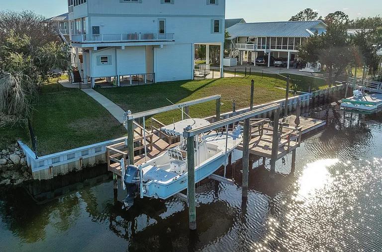 Boat house and dock on deep water canal for easy access to Gulf of Mexico, Wakulla and St. Marks River fishing, scalloping, diving, skiing and swimming. Custom designed and built with gorgeous 360 degree views of North Florida coastal beauty. Builder Kevin Gaby used special construction features such as standing seam roof, icynene insulation, concrete pilings, Hardie board siding & hot water circulation system. Interior elevator with stops on every floor. Other amenities include air conditioned workshop with bonus bathroom, outdoor storage, fenced yard, huge pantry and master closet, washer/dryer hook ups on both floors, gorgeous hardwood flooring, double ovens, office, safe, sunroom, screened room, wet bar and much more. Subdivision is gated in golf cart community.