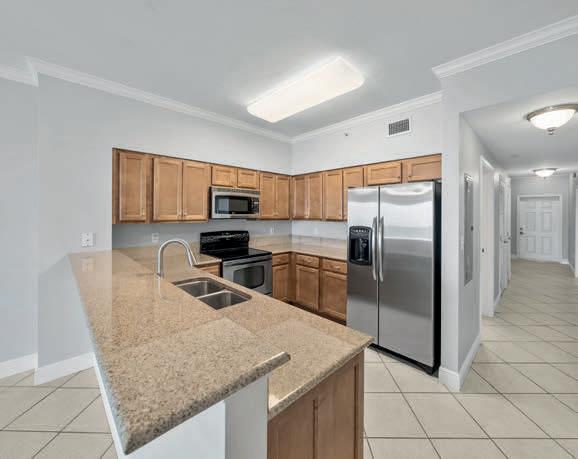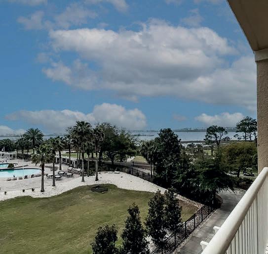 Experience relaxed Florida living at Magnolia Bay Club, from its gated entry and palm-lined drive to tranquil fountains welcoming you home. This top-floor residence offers sweeping bay views, a bright open layout, and a spacious living area with crown molding and tile floors. The kitchen features granite countertops, stainless steel appliances, and an eat-in bar flowing into the dining space. The primary suite includes a private entry, double vanities, jetted tub, separate shower, walk-in closet, and balcony access overlooking the water. Two additional bedrooms provide flexibility for guests, office, or playroom. Enjoy resort-style amenities including a waterfront pool, kayak launch, walking paths, gym, and community room—all within a secure, gated setting with covered parking. No short-term rentals; long-term leasing only.