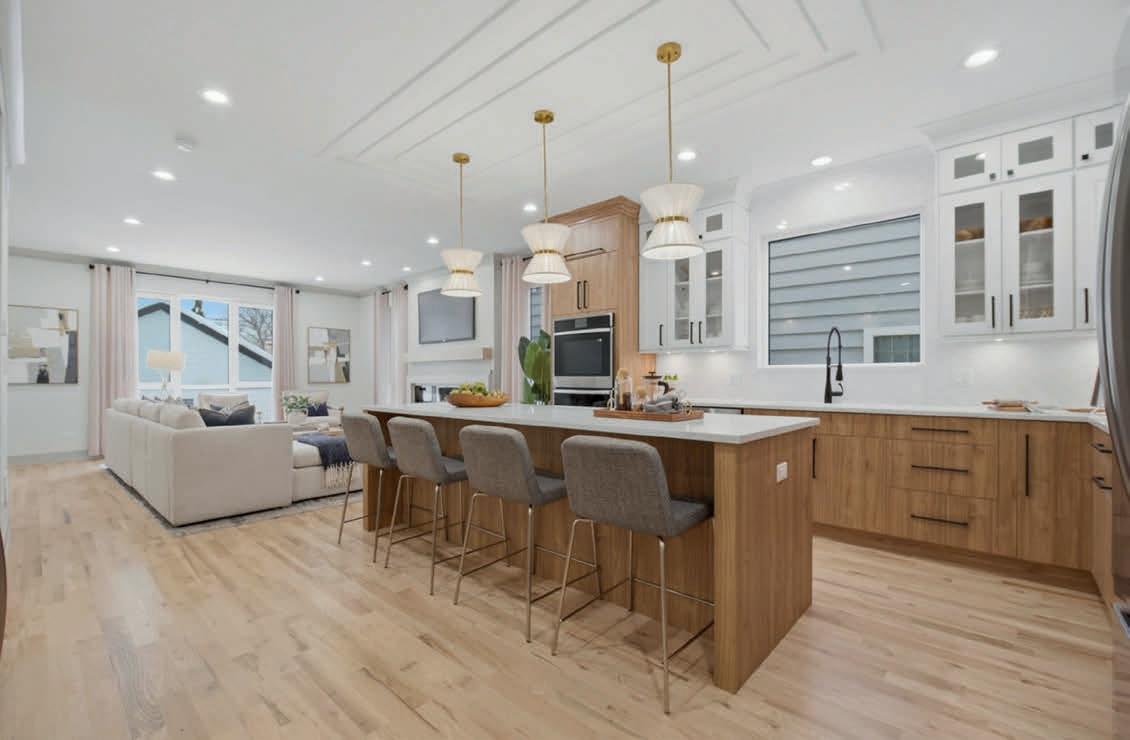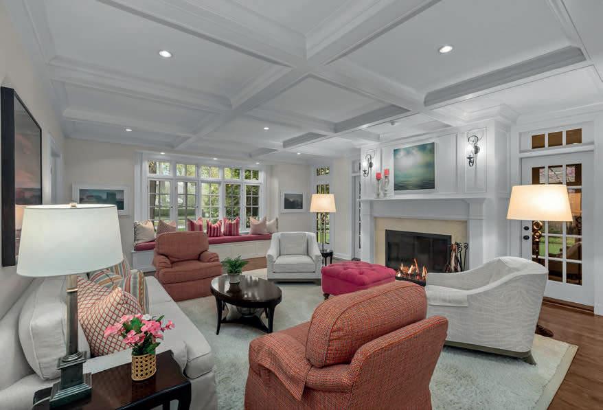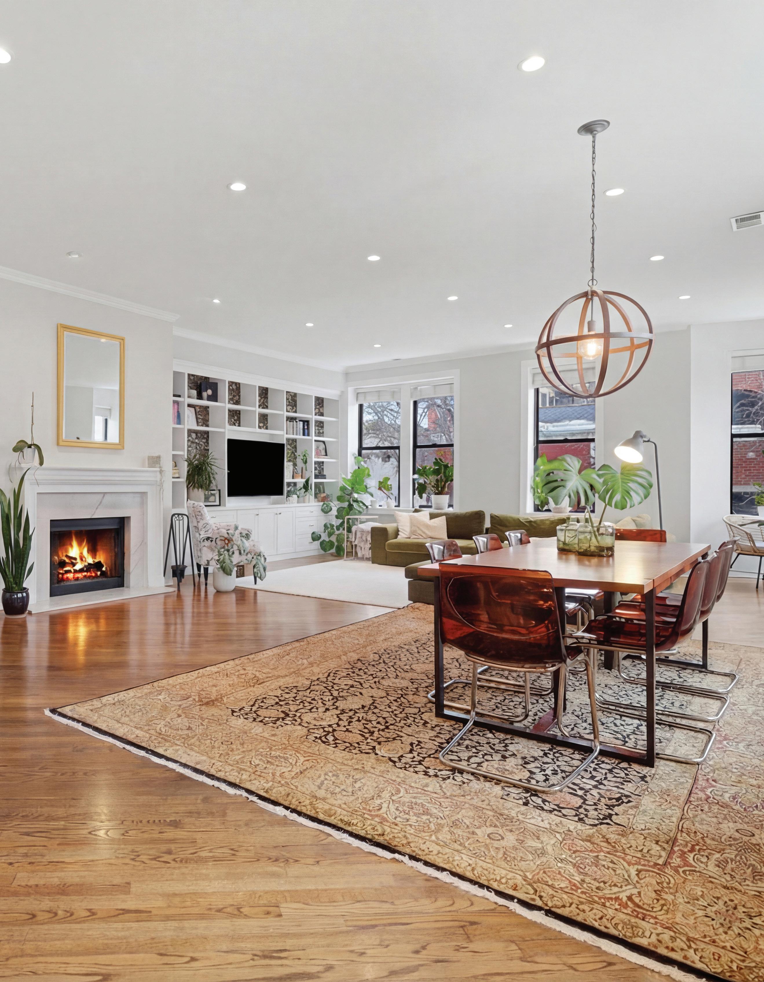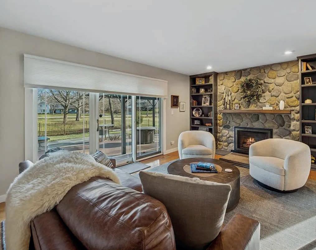 Designed for both everyday living and effortless entertaining, the expansive open-concept living, dining, and kitchen space is anchored by a striking wood-burning fireplace and custom built-ins. The bright chef’s kitchen features a large island, quartzite countertops with full-height backsplash, and seamless flow into the oversized living and dining areas.