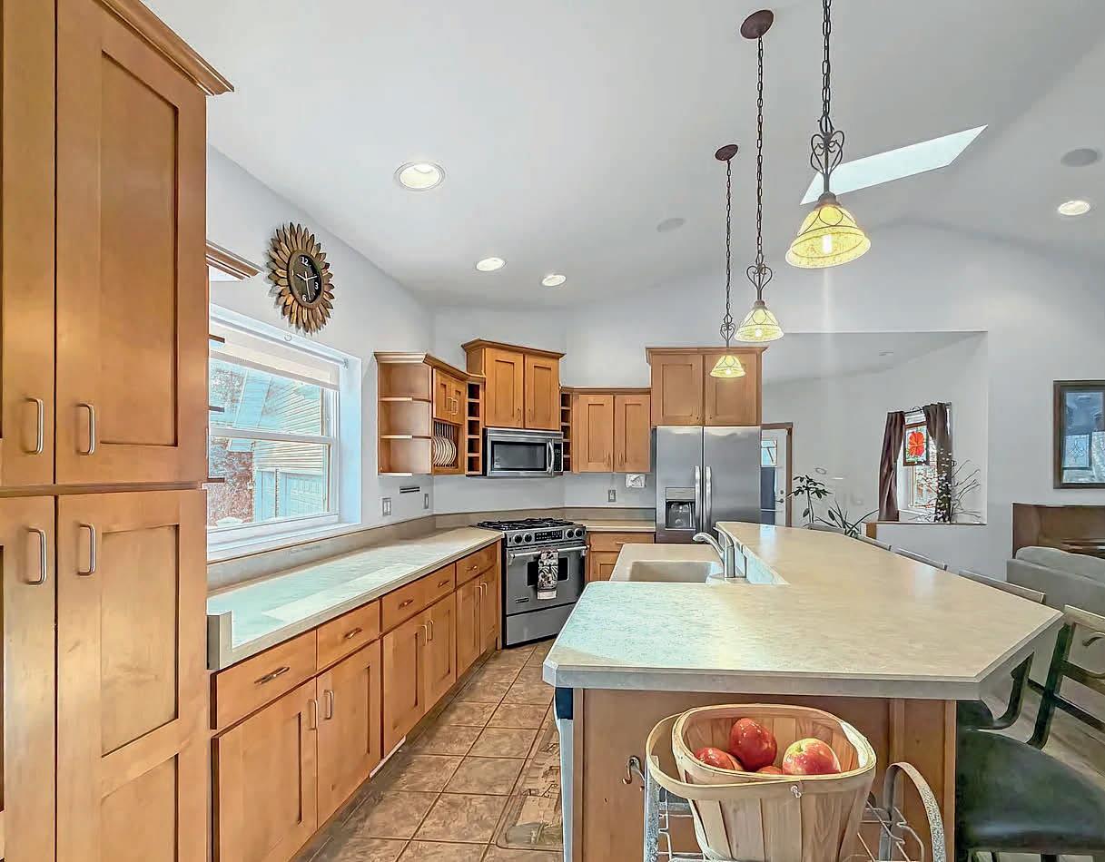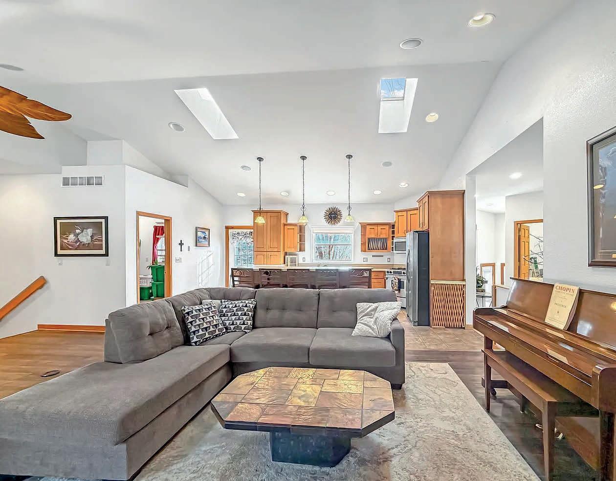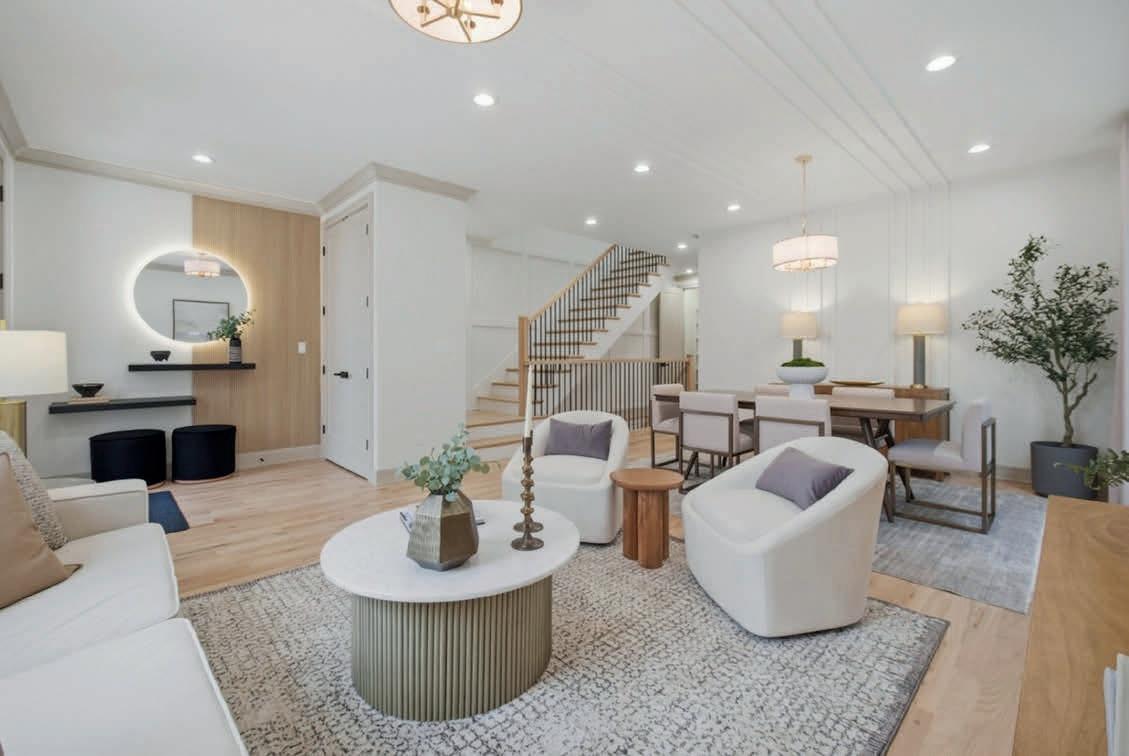 Designed for both everyday living and effortless entertaining, the expansive open-concept living, dining, and kitchen space is anchored by a striking wood-burning fireplace and custom built-ins. The bright chef’s kitchen features a large island, quartzite countertops with full-height backsplash, and seamless flow into the oversized living and dining areas.