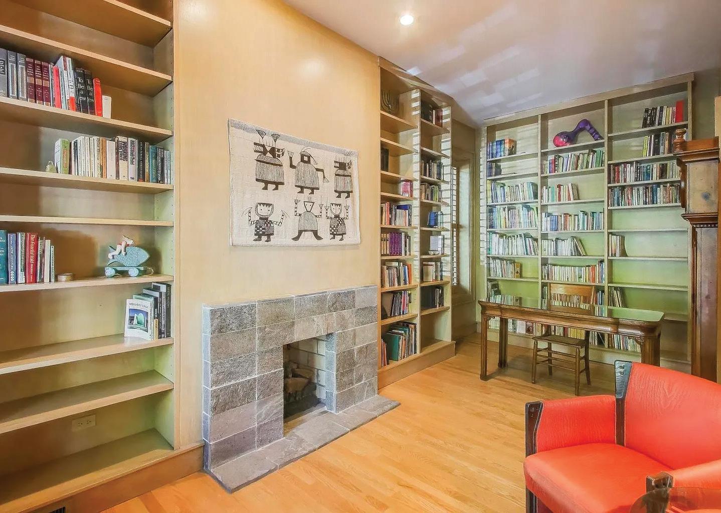 The expansive interior is perfect for a large household or anyone who enjoys generous living space. The main floor features a private library with gas fireplace, built-in bookshelves, and pocket doors. The long dining room with fireplace connects to the oversized kitchen, complete with a long island and sink, side-by-side refrigerator and freezer, gas cooktop, double ovens, abundant counterspace, and ample cabinetry. A large table faces the island, creating an ideal gathering space. A few steps down is the light-filled living room with French doors opening to both the backyard and front courtyard. A powder room, laundry pantry, and walk-in back closet complete this level.