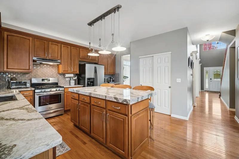 Welcome to your new home! A striking split-level residence in Richton Park where bold design meets everyday function. This fully renovated 3-bedroom, 2-bath home impresses from the start, offering 42” soft-close shaker cabinets, quartz countertops, and a spacious island at the heart of the chef-inspired kitchen. The living room stuns with an electric fireplace wrapped in onyx marble tile and sleek slated wood paneling, while the lower-level family room features a cozy gas fireplace perfect for gatherings. Upstairs, all three bedrooms provide generous space, with the primary suite boasting a double vanity, luxury body shower, and Bluetooth-enabled exhaust fan for added comfort and convenience. Nothing left to do but move in! *Agent Interest