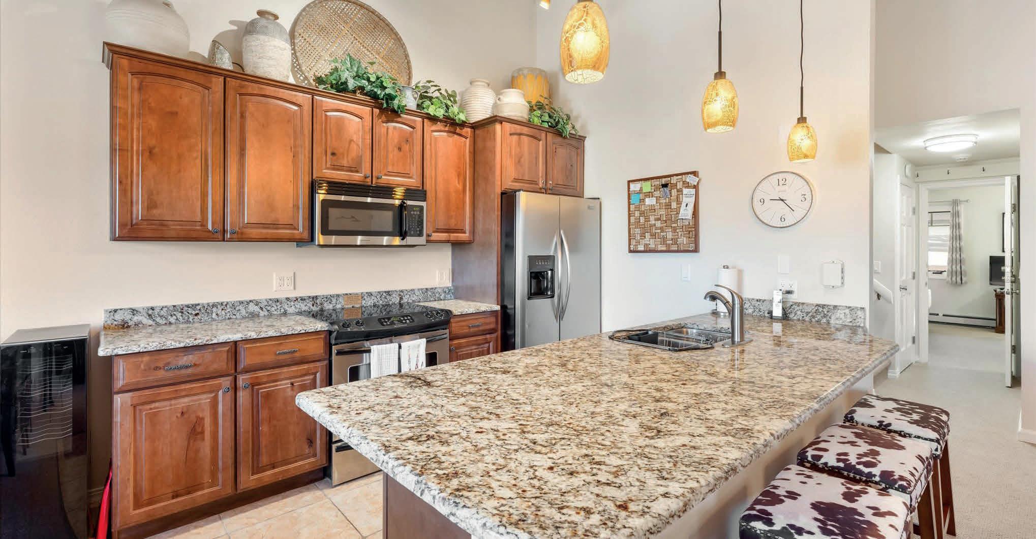 Designed for flexibility and comfort, it features a lock-off studio with its own kitchen, ideal for separate rentals or guest privacy. The interior has been tastefully remodeled with granite slab countertops, stainless steel appliances, updated lighting, refreshed bathrooms, and new carpet throughout. The studio kitchen, boiler, and window coverings have all been newly upgraded. Enjoy the convenience of a 1-car garage, covered parking, and ample storage, along with resortstyle amenities including an outdoor pool, fitness room, sauna, and clubhouse with a pool table. Offered fully furnished and located in Steamboat’s Green Zone for short-term rentals, this property combines exceptional comfort, prime location, and strong rental potential.
