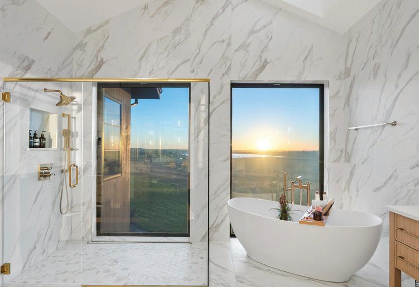 An 1800ft private drive leads to a striking arrival and a window-framed entry showcasing a two-story glass hallway with a glass roof. Inside, the great room soars beneath a 17’ vaulted ceiling with a floor to ceiling tiled Neolith wall and open flame gas fireplace. The chef’s kitchen is anchored by a 16’ Calacatta Lincoln Gold waterfall island with Thermador paneled refrigeration, Café GE gas range, dual ovens, and a concealed scullery. Walls of accordion doors open to an oversized patio, ideal for lounging and al fresco dining.