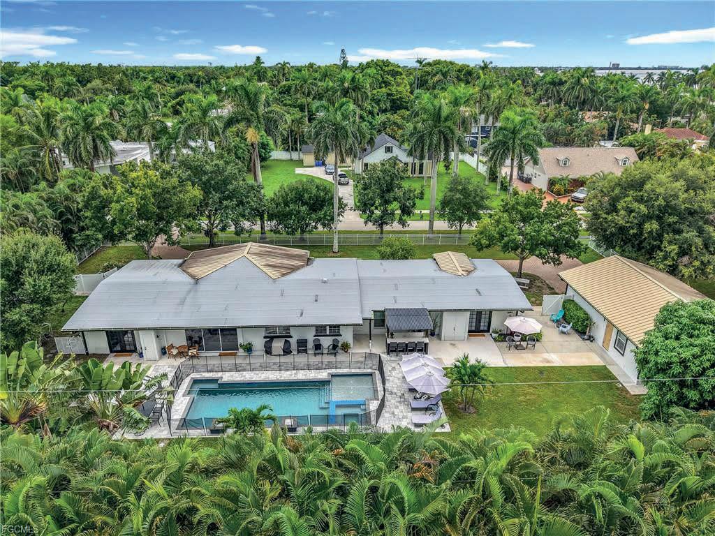 LUXURIOUS CUSTOM POOL, BEAUTIFUL LANDSCAPING on 0.53 acre in the Ft. Myers River District in this three-bedroom home with den/office, two baths plus a guest suite and double garage. Interiors embrace a modern, minimalist aesthetic, with a spacious kitchen that flows seamlessly into the living and dining areas. Samsung Bespoke appliances and quartz countertops are in the kitchen. Primary ensuite includes walk-in closets, double sinks, tandem shower, wall-mounted toilet and soaking tub. Custom firepit, fully fenced.