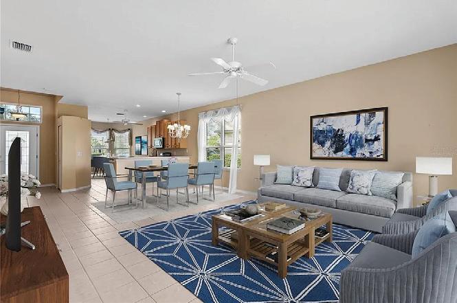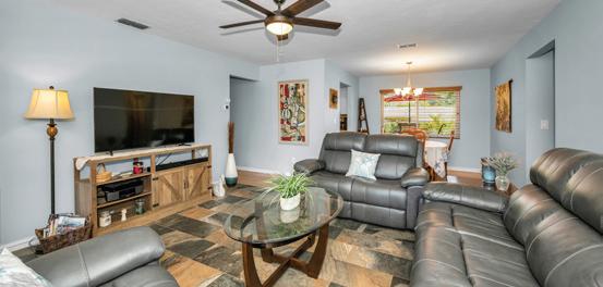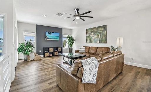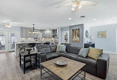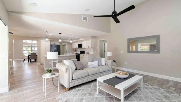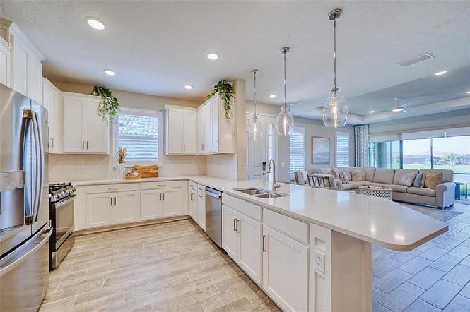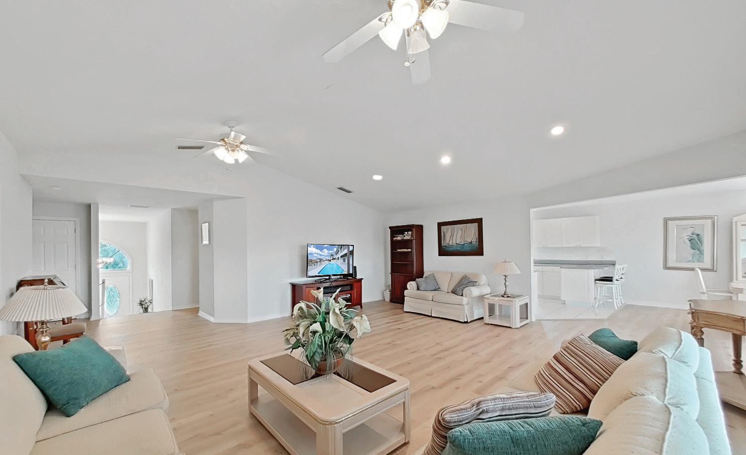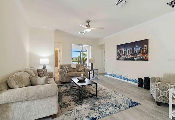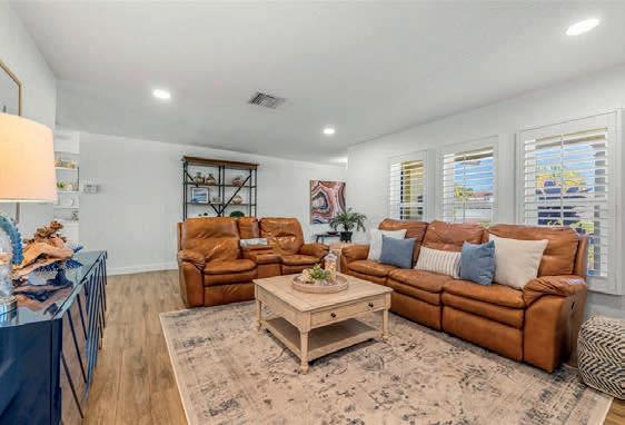 Beautifully updated and designed for easy living, this 3-bedroom home features a modern kitchen and baths, luxury vinyl plank flooring, and a split-bedroom layout for privacy. The spacious primary suite offers two walk-in closets, a spastyle shower, new vanities, and private pool access. Two guest bedrooms and bath complete the layout. The open kitchen flows into a large bonus room with stylish glass barn doors and impact sliders leading to a tropical pool oasis. Outdoor living includes a covered lanai with hurricane-impact screens and a custom pool with swim-up table and fountain. Additional features include a whole-house generator, lush landscaping, new pool pump (Dec 2025), and extensive upgrades. Quality built by Oyster Bay Homes, never rented, with transferable flood insurance and no history of water intrusion or hurricane damage.