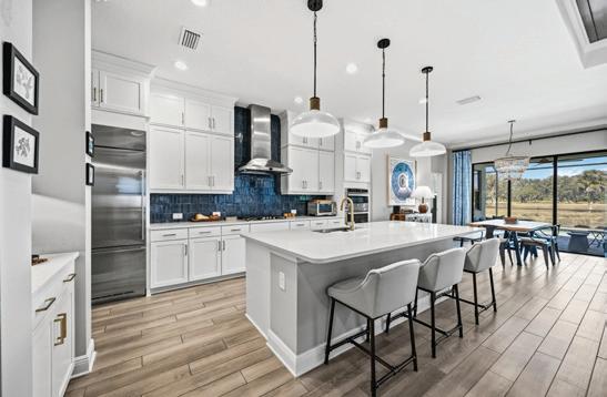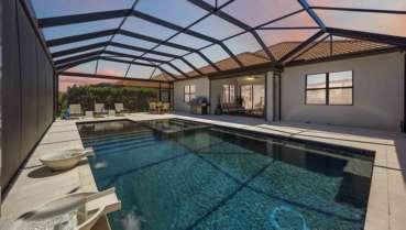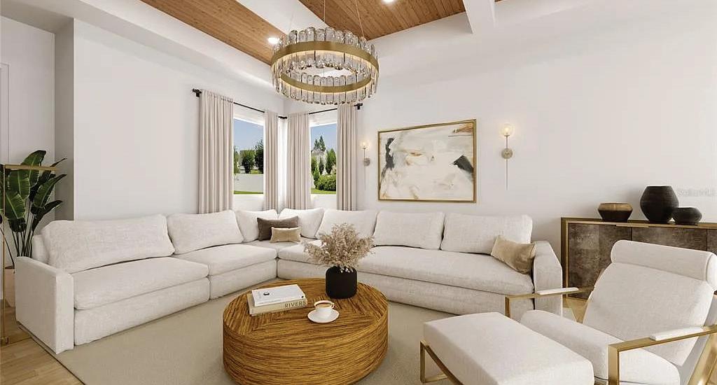 439 Madison is emerging as a striking new statement in modern coastal luxury — a rare opportunity to secure a fully custom, architecturally refined residence while construction is underway, with time remaining to personalize and select finishes. Designed with intention and executed with uncompromising quality, this home blends clean, modern lines with warm, natural materials. The exterior is thoughtfully composed with sand-finished HardiPlank siding, impact-rated insulated windows, an 8-foot stained fiberglass entry door, tongue-and-groove wood ceilings, and professionally designed, fully irrigated landscaping that frames a paver-lined driveway and expansive lanai. At the heart of the home, indoor and outdoor living merge seamlessly. A private pool and spa with sunshelf and heater create a resort-style setting, ideal for entertaining or quiet retreat. Inside, wide-plank wood flooring flows through the living spaces, complemented by porcelain tile in all baths and custom-built closets throughout. The chef’s kitchen is both elevated and inviting — featuring custom cabinetry with dovetail joinery and soft-close doors, 42” uppers with under-cabinet LED lighting, quartz countertops, a farmhouse sink, bespoke tile backsplash, and a professional-grade stainless steel appliance suite. The owner’s suite is a sanctuary of calm, offering a spa-inspired bath with a frameless glass walk-in shower, rain and handheld shower heads, quartz-topped vanities, custom cabinetry, and designer tile extending to the ceiling in all wet areas. Each additional bath echoes this same level of thoughtful luxury. Built for performance as much as beauty, the home features a reinforced concrete slab foundation, spray-foam insulated roof deck, rigid block wall insulation, and true high-efficiency construction. Additional highlights include a fully appointed laundry room with custom cabinetry, quartz counters, and utility sink; dual insulated garage doors with openers; an epoxy-finished garage floor; and a 10-year structural warranty. 439 Madison is more than a home — it is a carefully crafted lifestyle offering sophistication, longevity, and effortless modern living. With construction underway and completion slated for 2026, this is a rare chance to shape a luxury residence tailored to your vision.