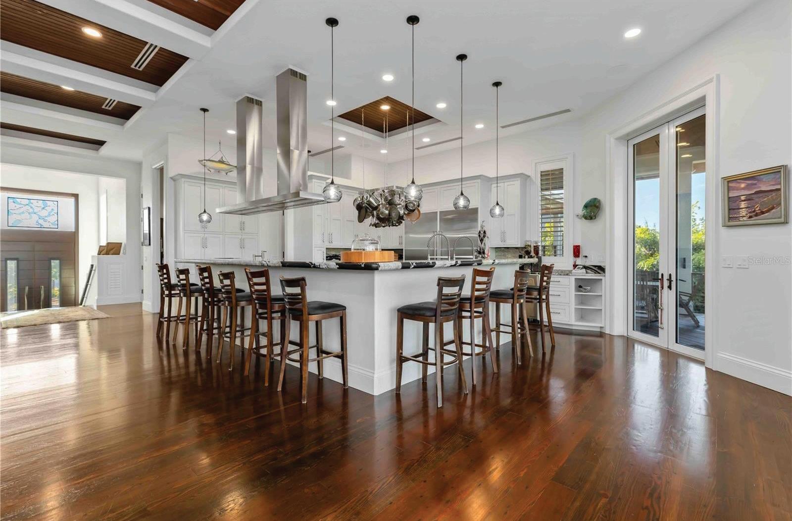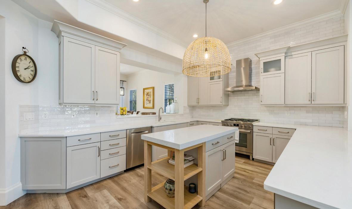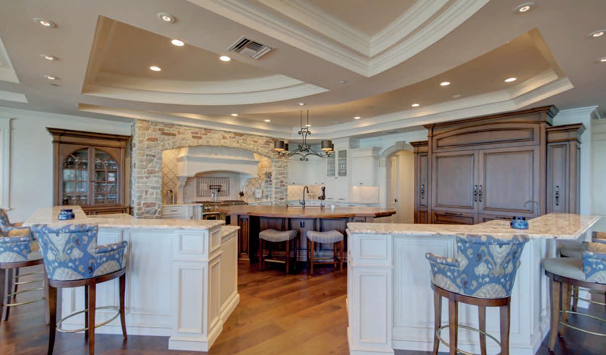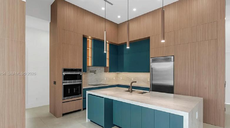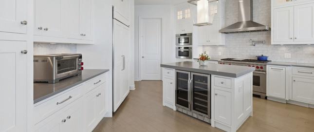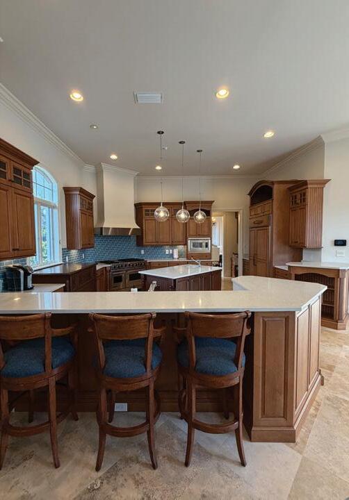 • Custom kitchen with tall cabinetry, quartz countertops, glasstile backsplash, and high-end stainless-steel appliances