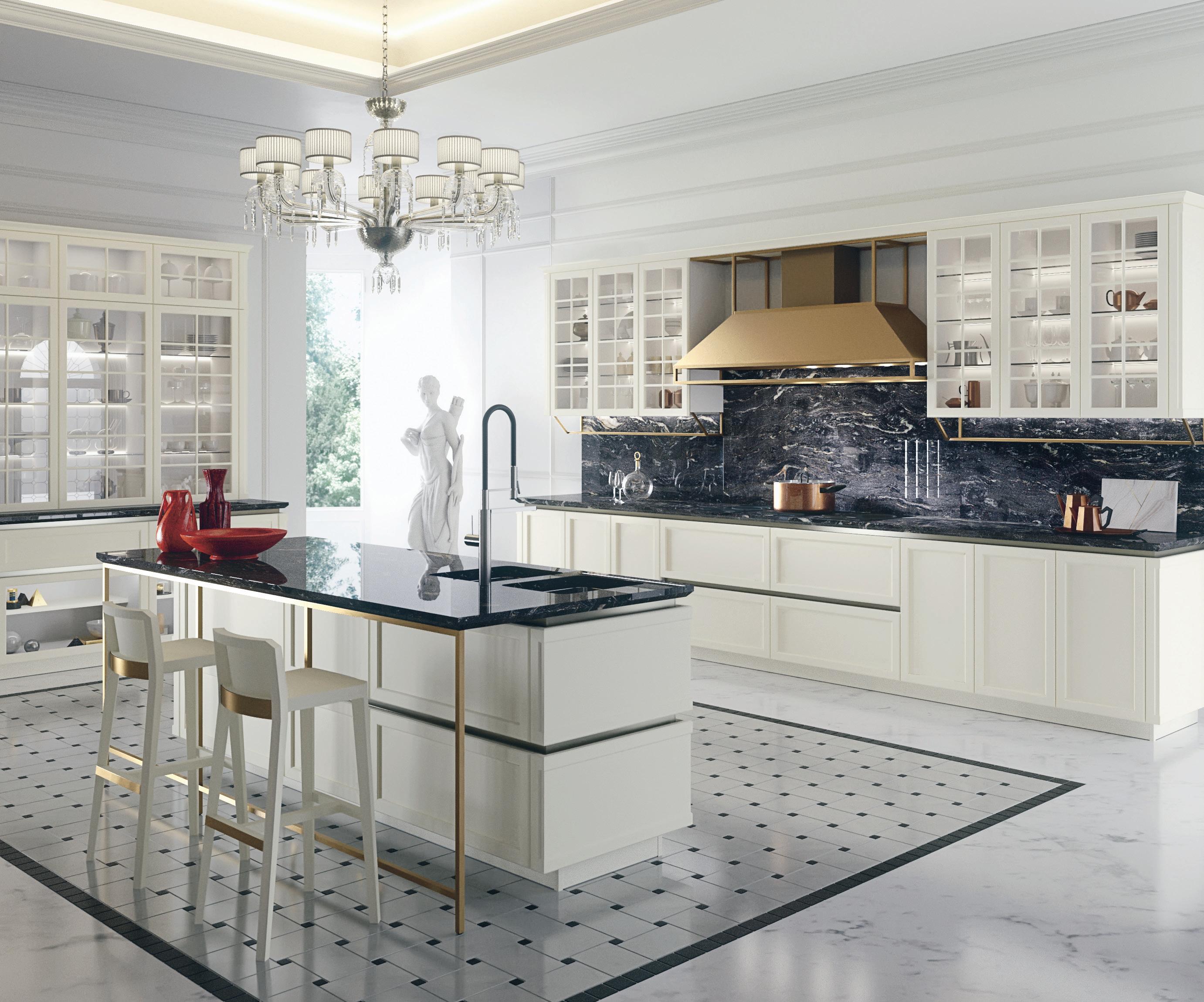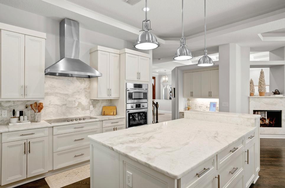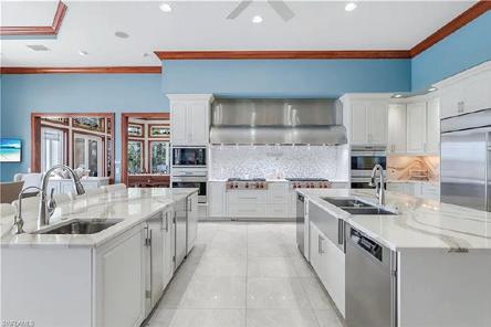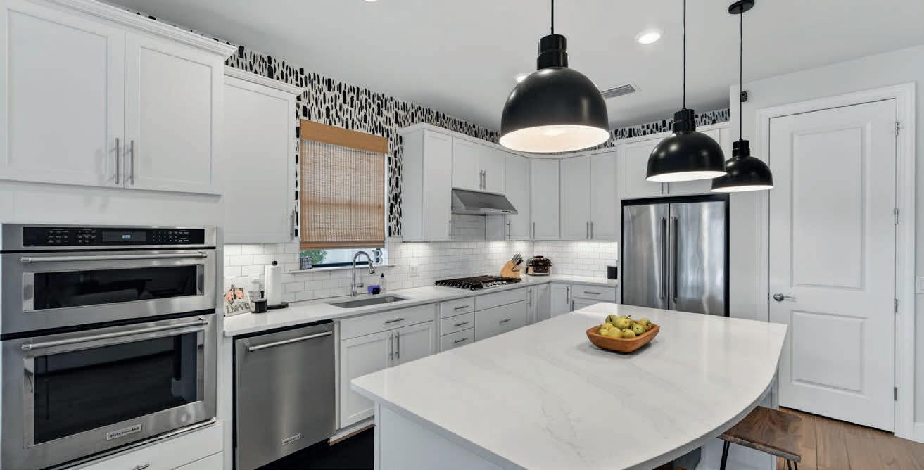 • Custom kitchen with tall cabinetry, quartz countertops, glasstile backsplash, and high-end stainless-steel appliances