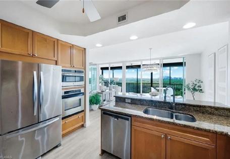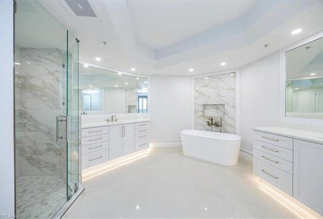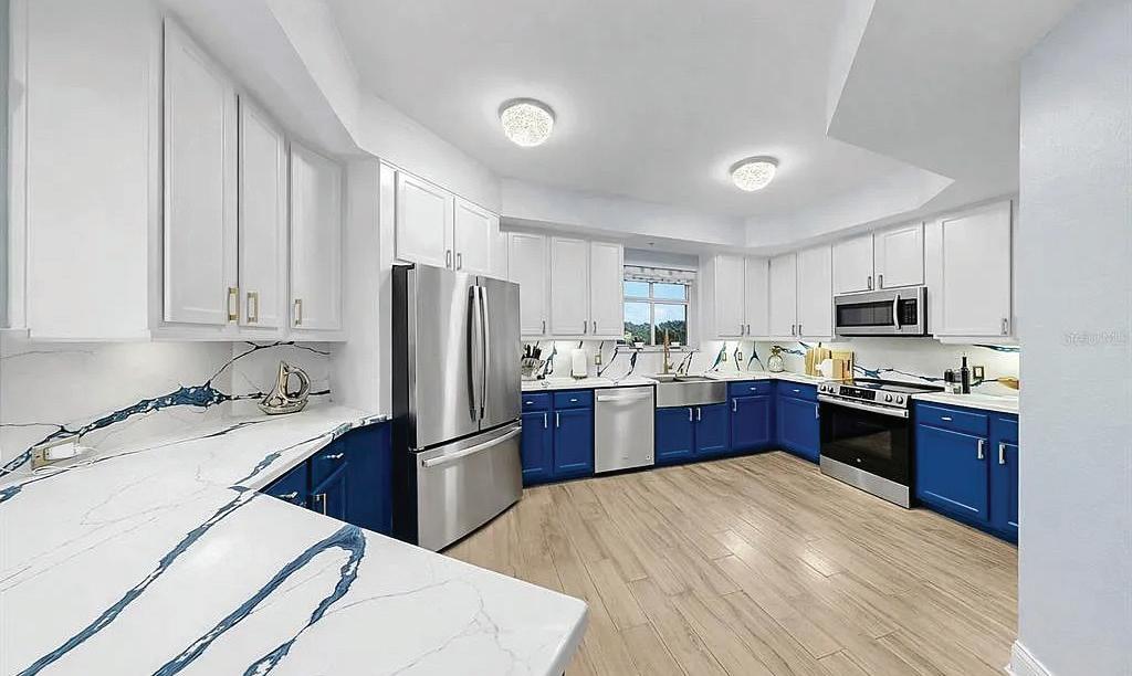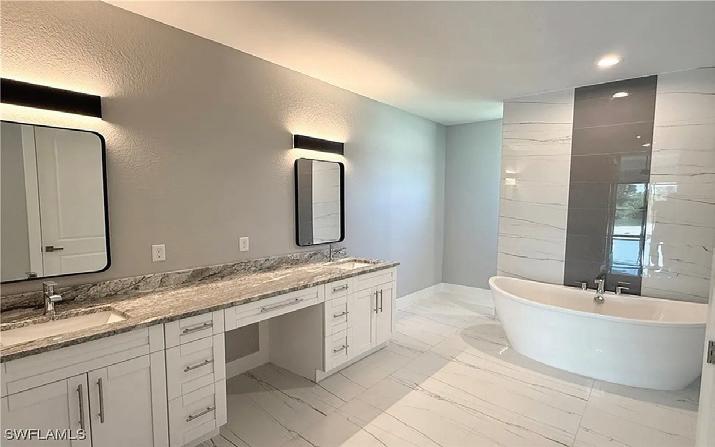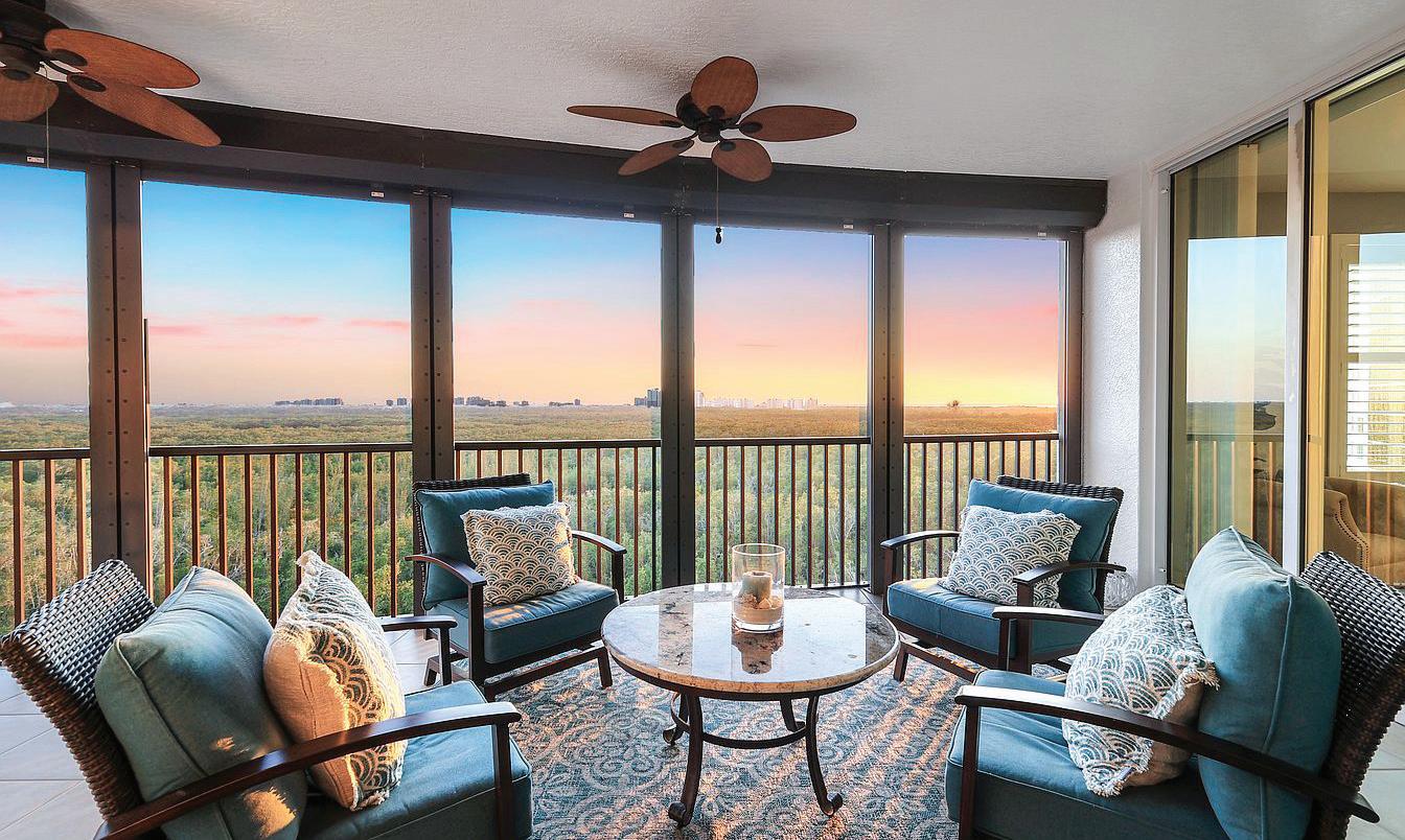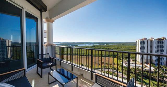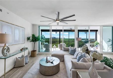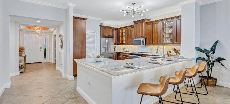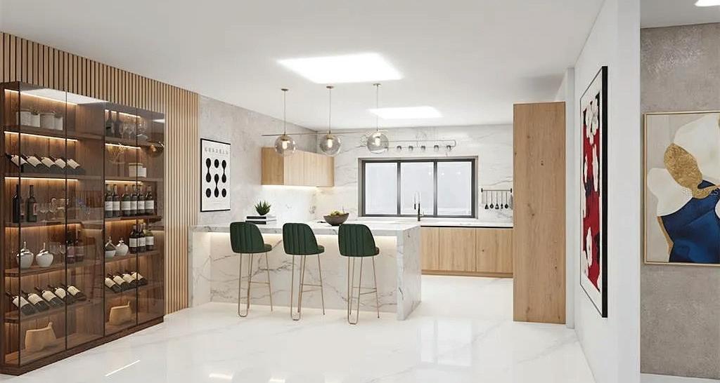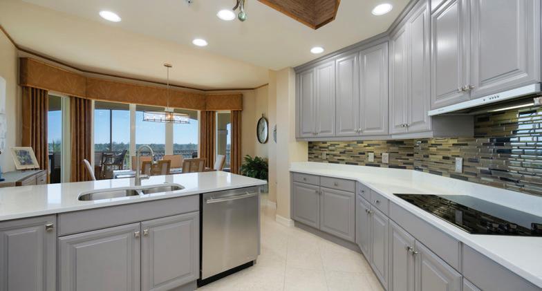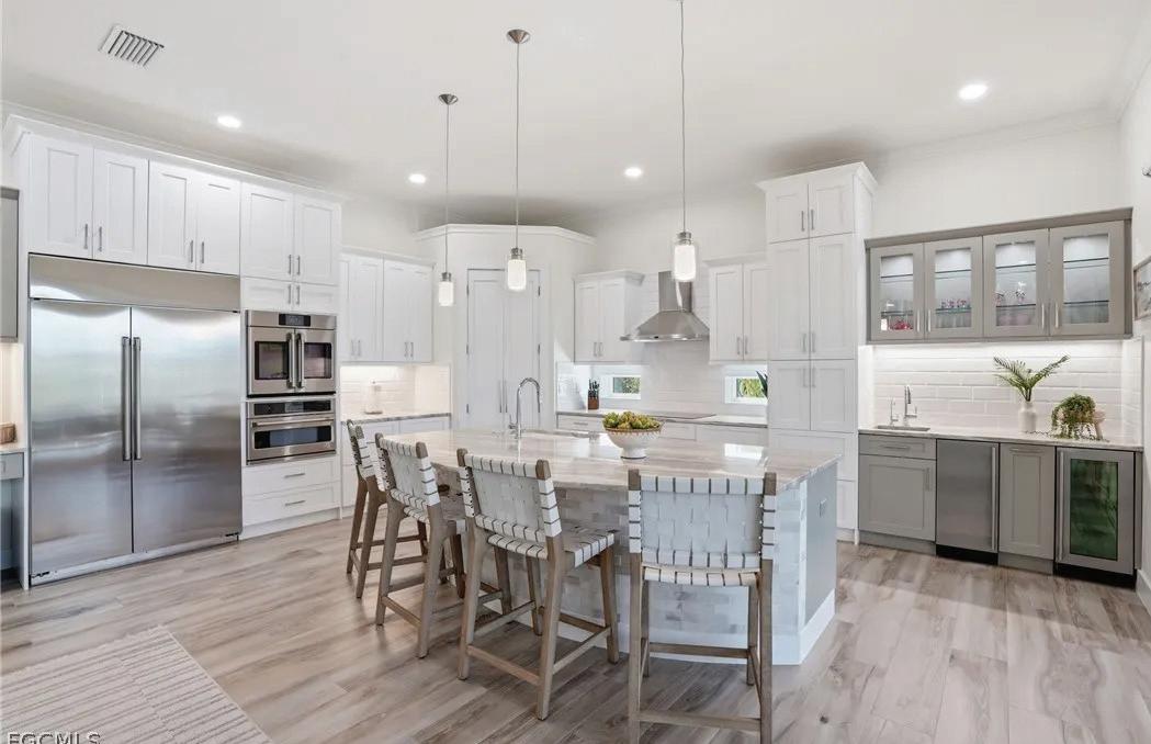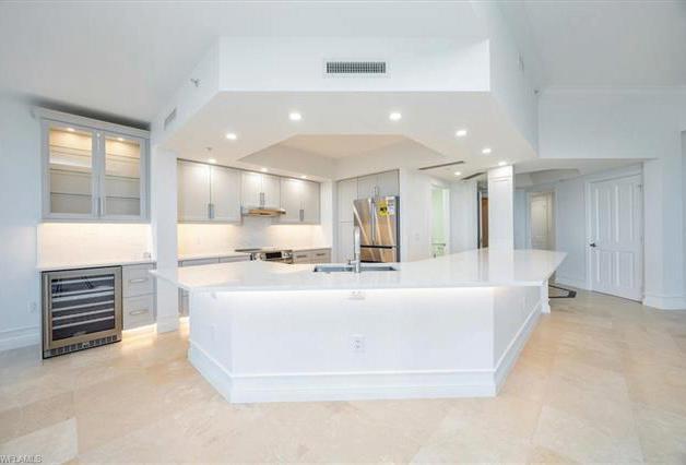 Stunning PENTHOUSE Skyhome with GULF VIEW. SELLER HAS OVER $1.3 MILLION INVESTED IN THIS HOME. SELLER’S LOSS IS YOUR GAIN! Discover unparalleled luxury and serenity in this FULLY REDESIGNED and RENOVATED 3-bedroom, 3.5-bathroom penthouse SKYHOME, located in the prestigious Aversana at Hammock Bay Golf and Country Club. Boasting soaring 12-foot ceilings and breathtaking PANORAMIC VIEWS of the Ten Thousand Islands, Marco Island, and the Gulf of Mexico, this exquisite residence includes ALL NEW KITCHEN, BATHROOMS, and LAUNDRY and offers the ultimate in elevated living. Step off your private elevator into an open-concept floor plan, where every room showcases sweeping vistas. The CHEF’S KITCHEN features custom cabinets, sleek stainless steel Bosche appliances, and elegant quartz countertops. The adjacent BAR AREA is perfect for entertaining, with a wine refrigerator, built-in liquor storage, and illuminated glass cabinets.