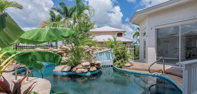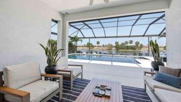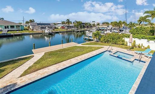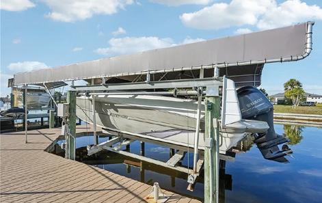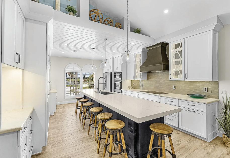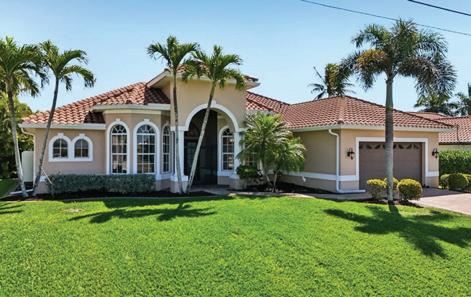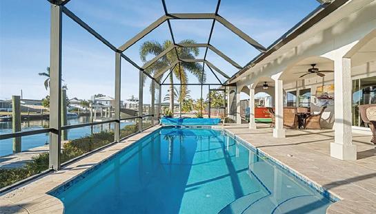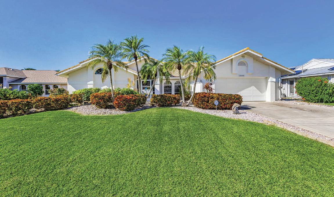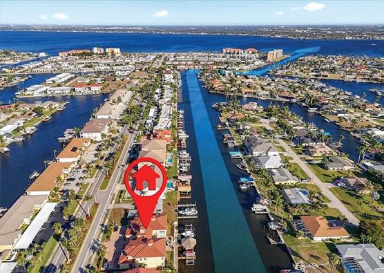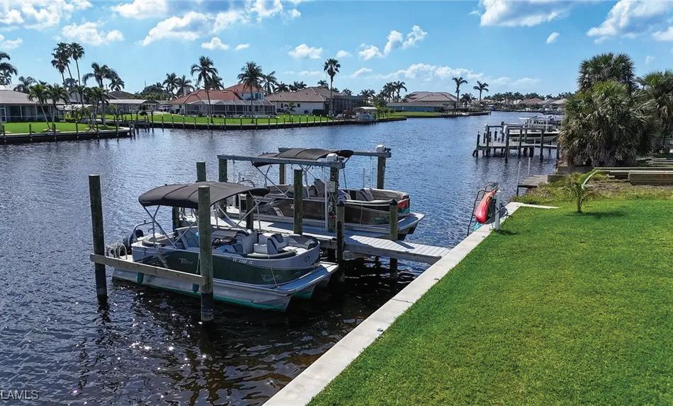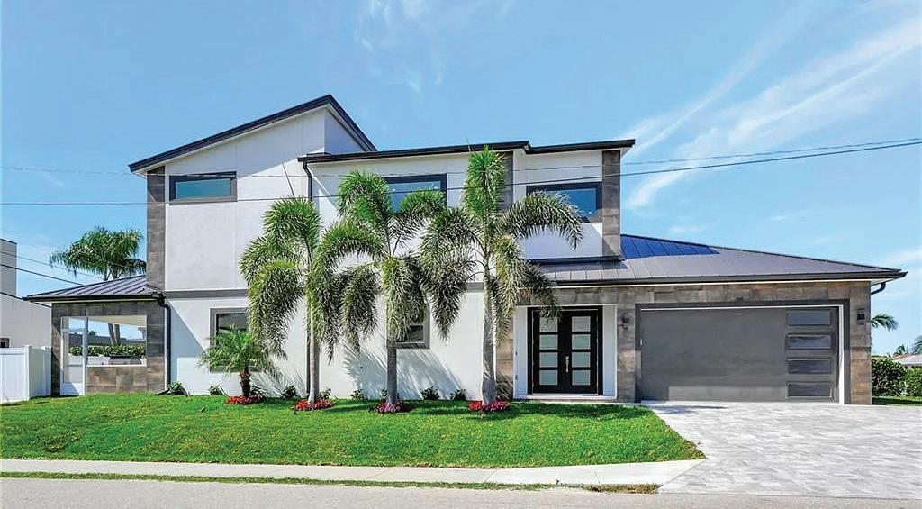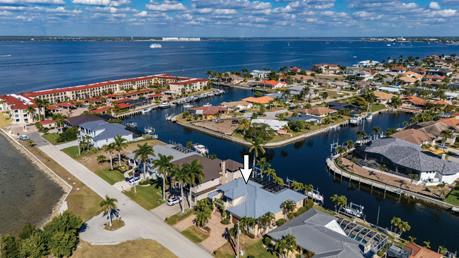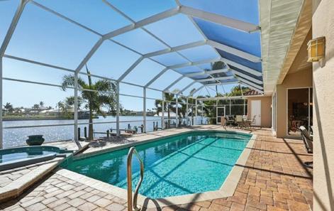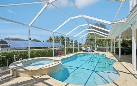 SW Cape Coral, Florida. This beautiful modern “courtyard style” 4 BEDS, 4 BATHS Gulf access waterfront home is situated on a .32 acre corner lot. The unique ranch style home was recently remodeled and includes a detached guest suite designed with a kitchenette, refrigerator, walk in shower which serves as a pool bath. Brightly redesigned kitchen features Quartz waterfall island and countertops, custom soft close cabinets, cathedral ceilings, and Samsung stainless steel appliances. The Jack-and Jill bathroom connects two guest rooms. The guest, and or flex room, provides access to the generous sun deck, overlooking the water, the Florida sunsets. The boat lift accommodates up to an 8000 pound vessel. The two-car garage and functional curved driveway provide ample parking for family & guests. Located a short distance from Cape Harbour Marina, the Westin, and nearby trendy restaurants, shops and grocery.
