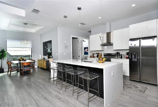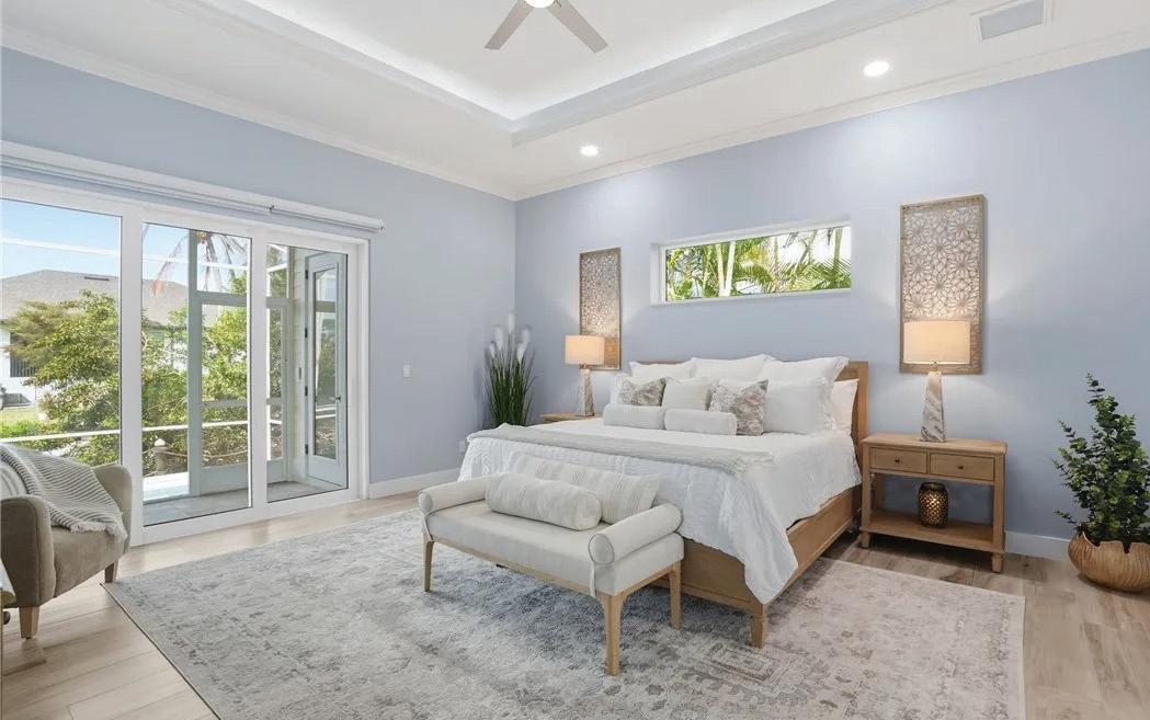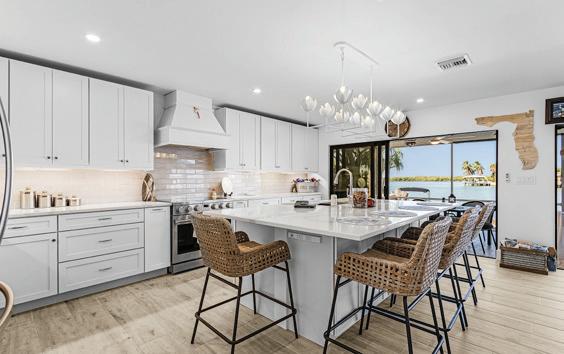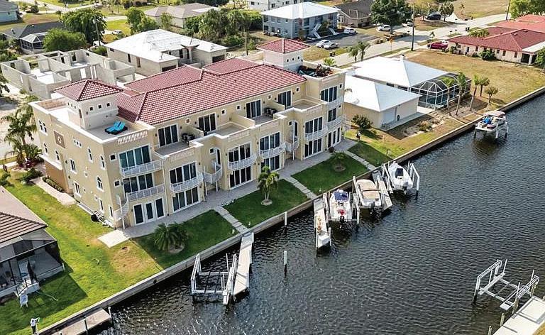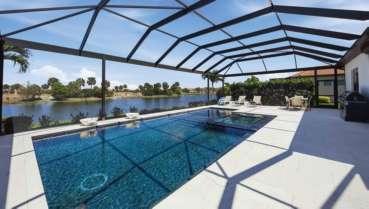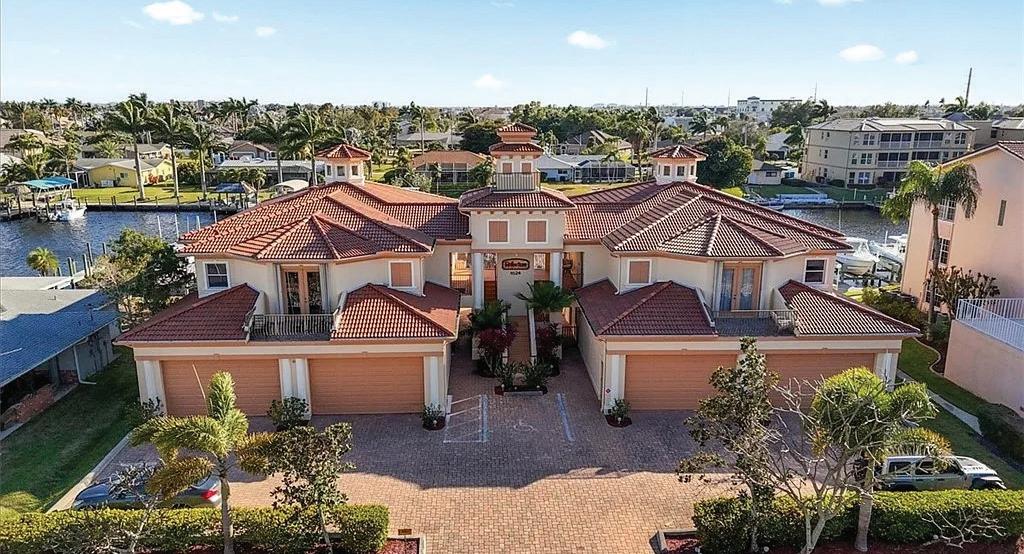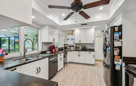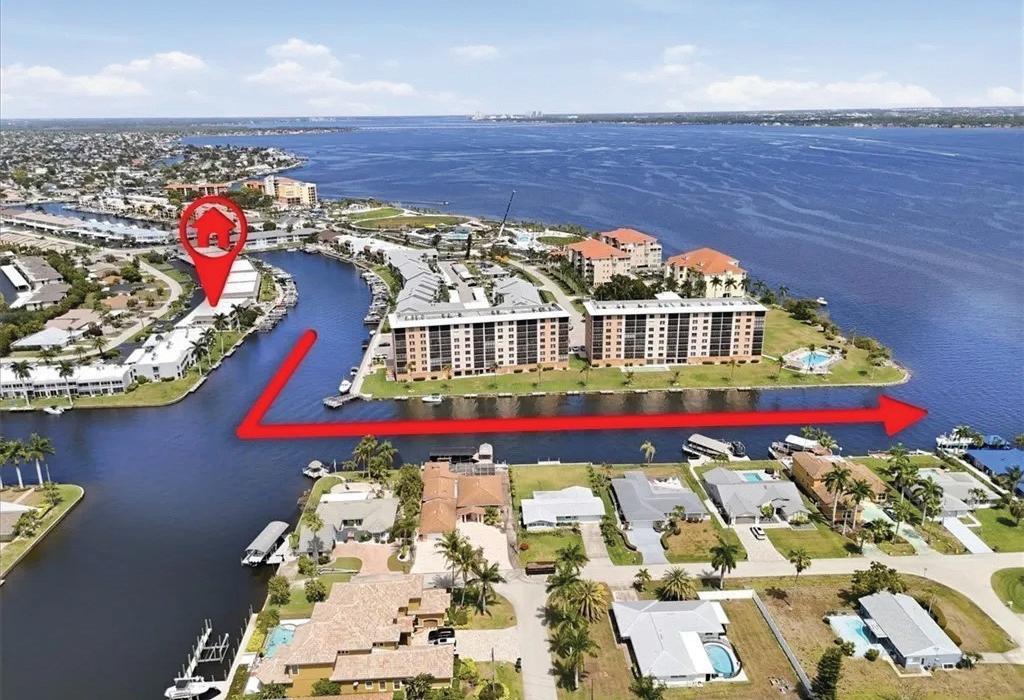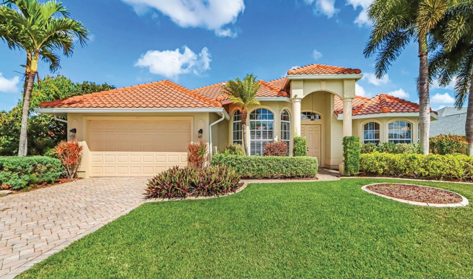 SW Cape Coral, Florida. This beautiful modern “courtyard style” 4 BEDS, 4 BATHS Gulf access waterfront home is situated on a .32 acre corner lot. The unique ranch style home was recently remodeled and includes a detached guest suite designed with a kitchenette, refrigerator, walk in shower which serves as a pool bath. Brightly redesigned kitchen features Quartz waterfall island and countertops, custom soft close cabinets, cathedral ceilings, and Samsung stainless steel appliances. The Jack-and Jill bathroom connects two guest rooms. The guest, and or flex room, provides access to the generous sun deck, overlooking the water, the Florida sunsets. The boat lift accommodates up to an 8000 pound vessel. The two-car garage and functional curved driveway provide ample parking for family & guests. Located a short distance from Cape Harbour Marina, the Westin, and nearby trendy restaurants, shops and grocery.