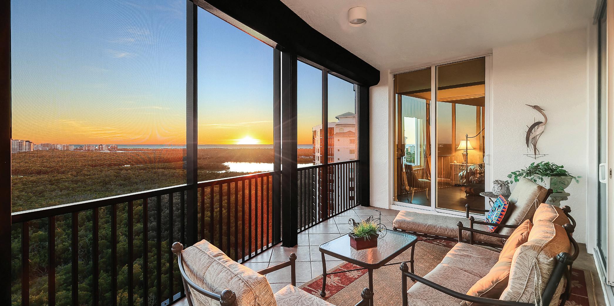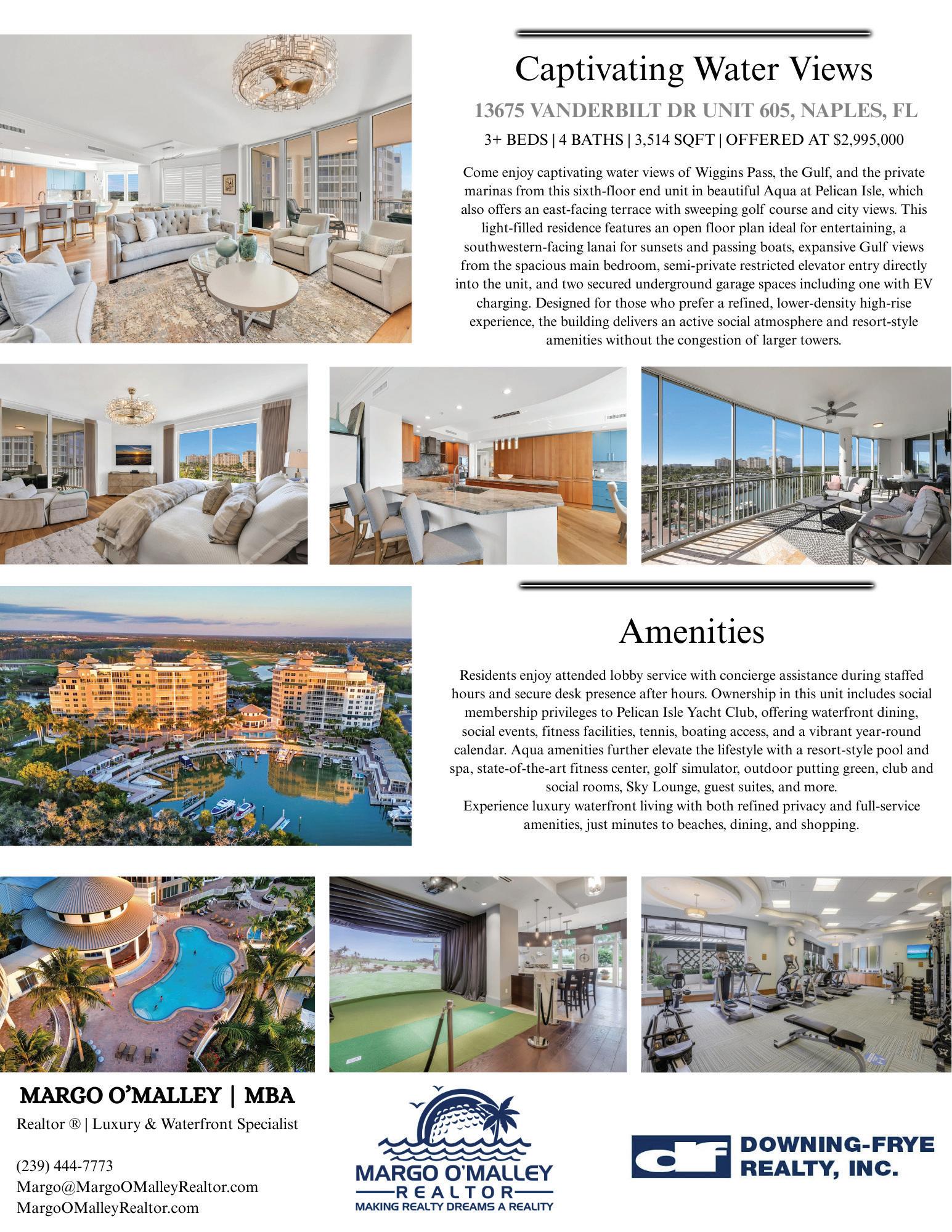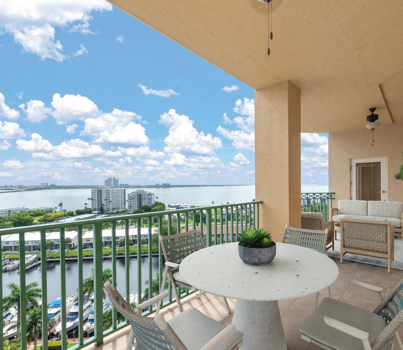 Enjoy a commanding vantage point above Estero Bay with sweeping views to the Gulf beyond from Azure 2301. Originally configured as three bedrooms plus a den with three-anda-half baths, extensive renovations in 2015 transformed the formal living room into an additional den or office, enhancing both functionality and flexibility. Notable custom enhancements include a striking wine cellar and beautifully updated bespoke woodworking in the dining and living areas. The residence includes a deeded, oversized private enclosed two-car garage with space for additional recreational equipment. A private elevator lobby with secured elevator entry ensures exclusivity and privacy. The gourmet kitchen is thoughtfully appointed with a Wolf gas cooktop, SubZero refrigerator, Wolf double wall ovens, and dual U-Line refrigerator drawers for convenient, flexible cold storage. The spacious balcony features a gas grill, ideal for outdoor entertaining while enjoying the exceptional views.