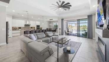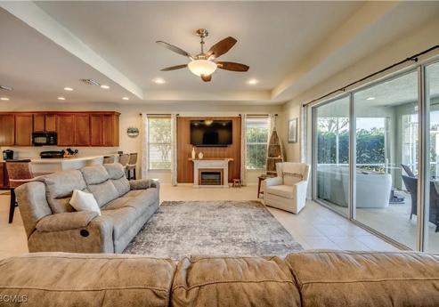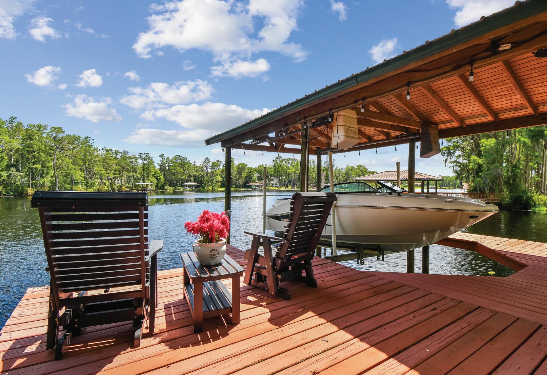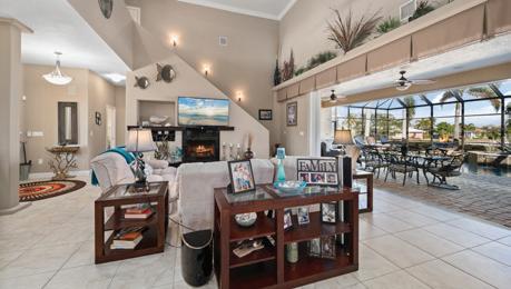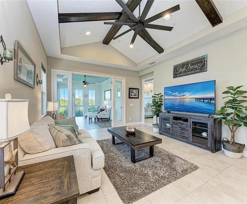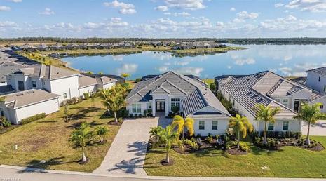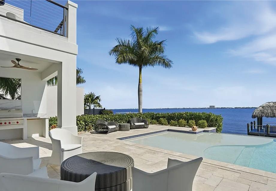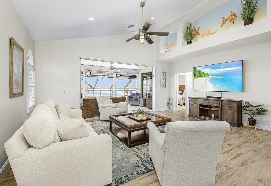 As you enter this stunning residence, you are immediately captivated by breathtaking lake views and an exceptional blend of luxury and design. This beautifully upgraded WCI-built home features a soughtafter great room, split-bedroom floor plan and is designed for both refined living and effortless entertaining. Outdoor living is elevated to resort-style perfection with a private boat dock, custom saltwater infinity-edge pool, outdoor kitchen, custom bar, and multiple seating areas—all overlooking serene water views. Inside, the open-concept layout seamlessly connects the great room, formal dining area, kitchen, and breakfast nook, creating an inviting space ideal for gatherings.