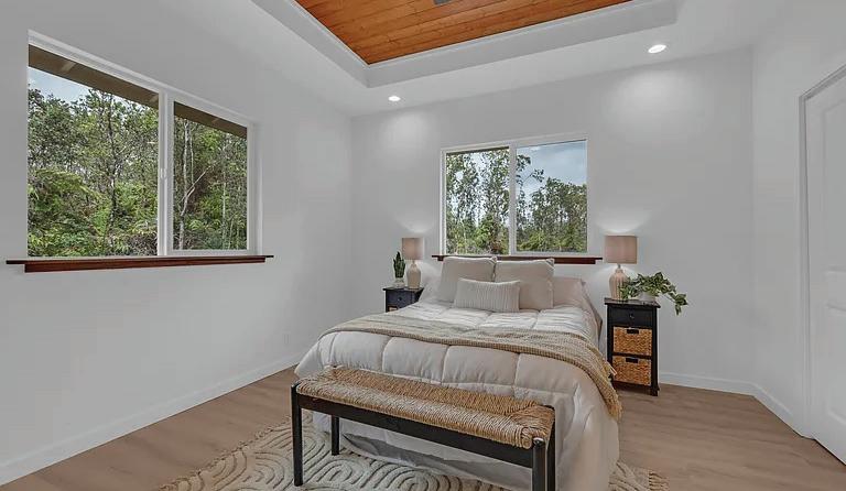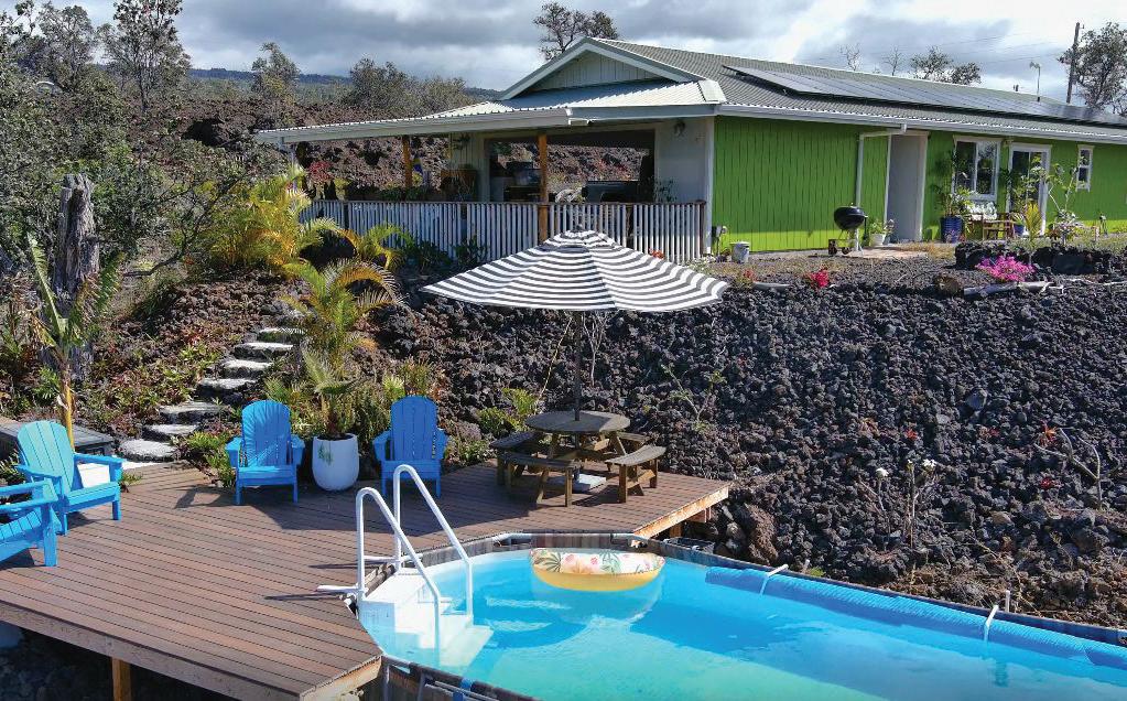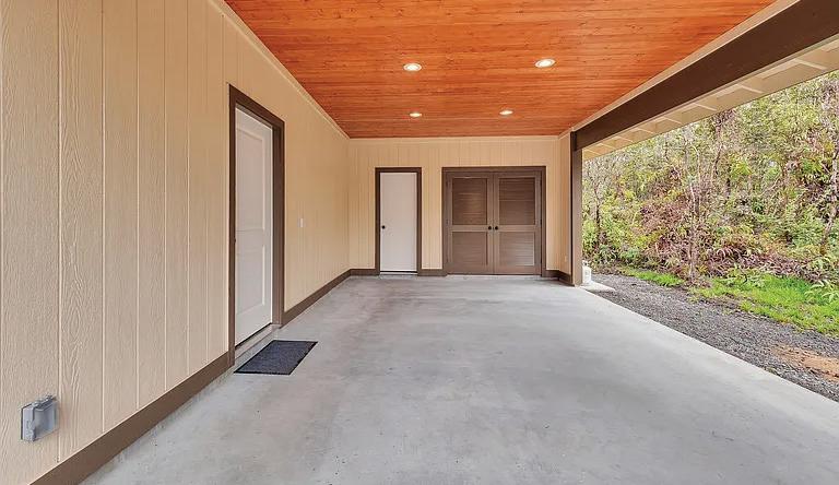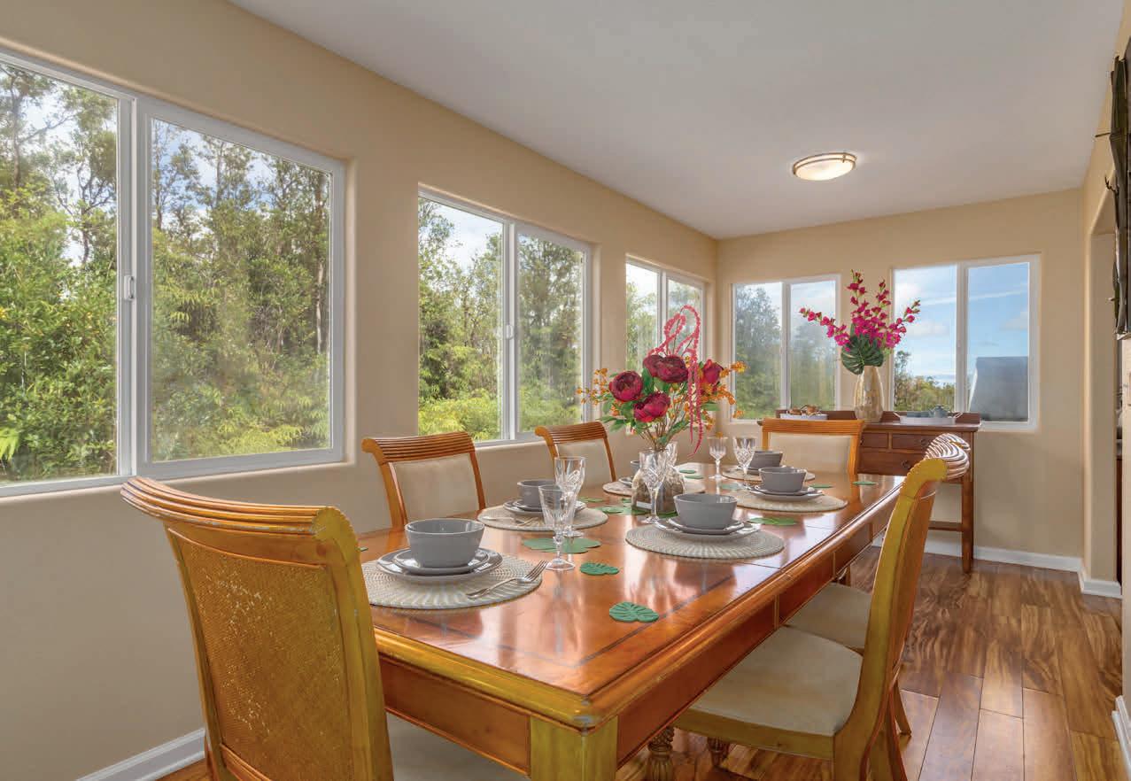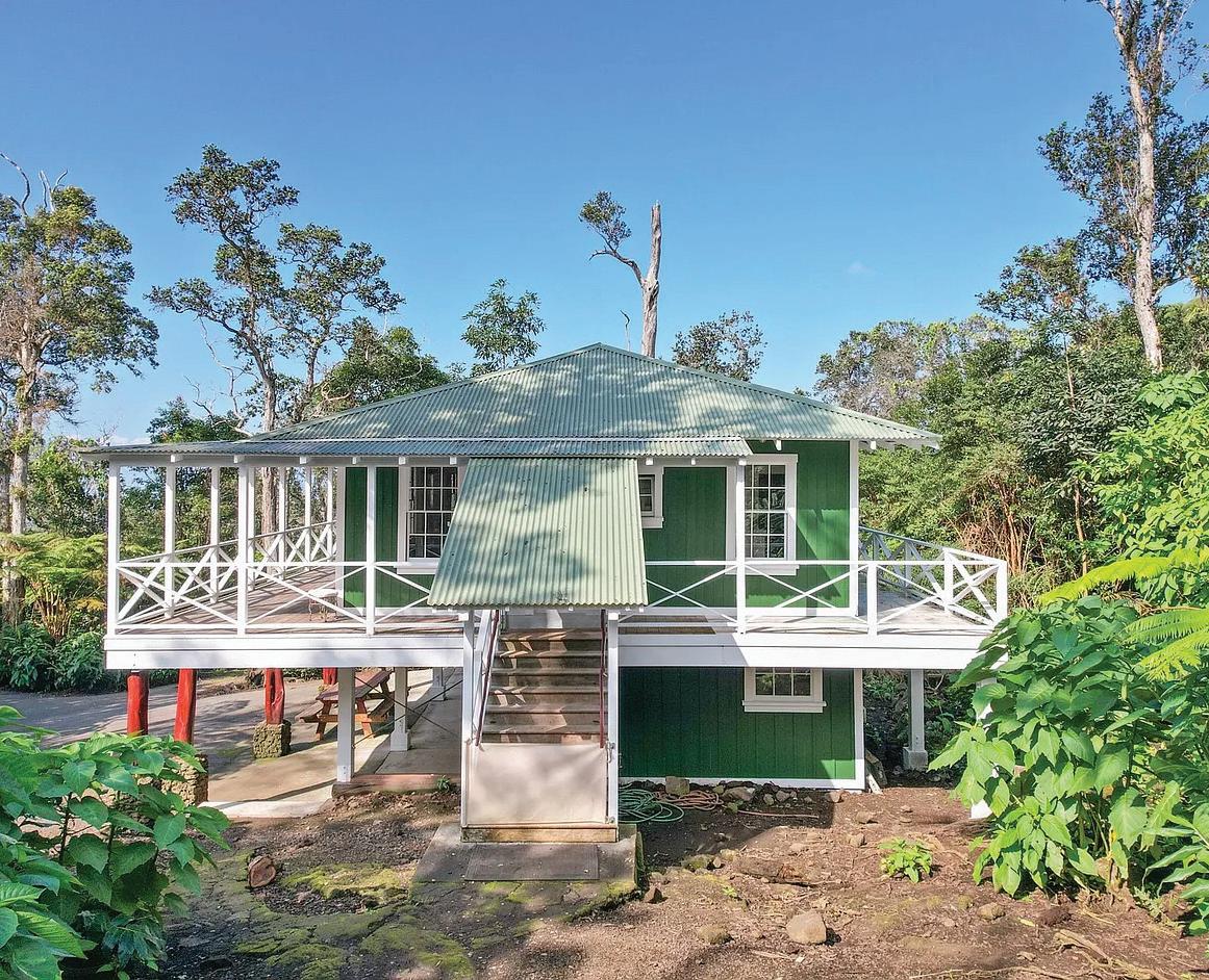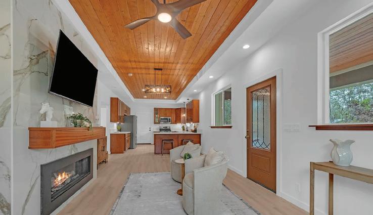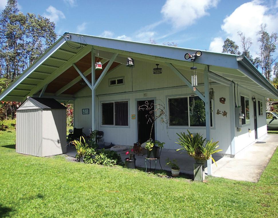 This thoughtfully crafted custom home beautifully complements the Volcano lifestyle. Enter through a spacious private lanai featuring floor-toceiling tiled columns and rain chains that create a tranquil ambiance. Inside, the living room showcases a gas fireplace that warms both the space and the primary bedroom through a split venting system. Vaulted 10-foot tongue-and-groove wood ceilings extend throughout the living room, kitchen, and bedrooms. The flexible layout includes a second bedroom or home office. The spa-like bath features a jetted soaking tub surrounded by windows, dual sinks, a separate shower, and a private water closet. The kitchen offers quartz countertops with bar seating, glasspane cabinets, and new appliances including a gas range. A covered carport provides parking, with an attached second bath and laundry area equipped with washer, dryer, and UV water filtration. The partially cleared lot blends natural forest and lava rock features. Located less than five miles from Hawaii Volcanoes National Park, this home offers a serene retreat with easy access to adventure.