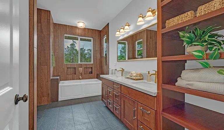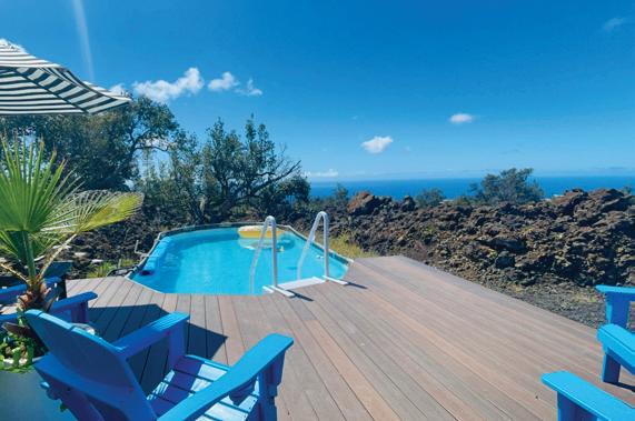 The middle level includes three ensuite bedrooms, including a primary suite that opens to a covered lanai. An outdoor soaking tub imported from Japan is positioned to take in views of the Pacific Ocean and the slopes of Mauna Kea, Mauna Loa, and Hualālai. On the lower level, a guest suite with its own kitchenette and separate entrance adds flexibility for visitors or extended family.