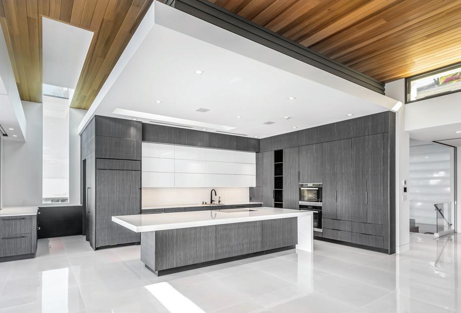 The residence is now arranged across three levels. On the upper floor, the kitchen, dining, and living areas are combined into an open gathering space suited to daily life and entertaining. The kitchen includes SubZero and Wolf appliances and a custom yellow cedar-and-concrete island with an integrated cooktop. Expansive lanais, along with an outdoor pizza oven and built-in barbecue, extend the living space outdoors.