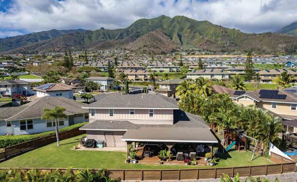 Entertainer’s delight! Owners transformed this property into one of Maui’s premier homes in the Kehalani master-planned community, ideal for relaxing under a super-sized covered lanai, and enjoying serene ocean and Haleakala mountain views. Through having a retaining wall built and bringing in fill, an area for a wide lawn and expansive covered lanai was created. The owners meticulously maintain the yard and foliage, converting what was once a cookie-cutter home into a one-of-a-kind breathtaking locale for welcoming friends and family. Visitors are surprised by the sense of privacy in a location so convenient to schools, shopping, government offices, parks and more. The downstairs features engineered hardwood floors in the living room, dining area, and family room. The family room opens to the extra-large covered lanai, which features Trex flooring and a sprinklered backyard accessible from side gates. The kitchen, with bar-stool seating at the island with granite counter-tops, includes a new Bosch dishwasher, a double-oven range, refinished cabinets and porcelain tile floors. A fun under-stairs play area, half-bathroom with bidet and 2-car garage with Tesla charger (compatible to other EV vehicles with an adaptor) in front of the home are also on the ground level. 3 bedrooms and 2 remodeled bathrooms are located upstairs, with ocean and mountain views. The property comes with 2 Mitsubishi split air-conditioners (master bedroom and downstairs).