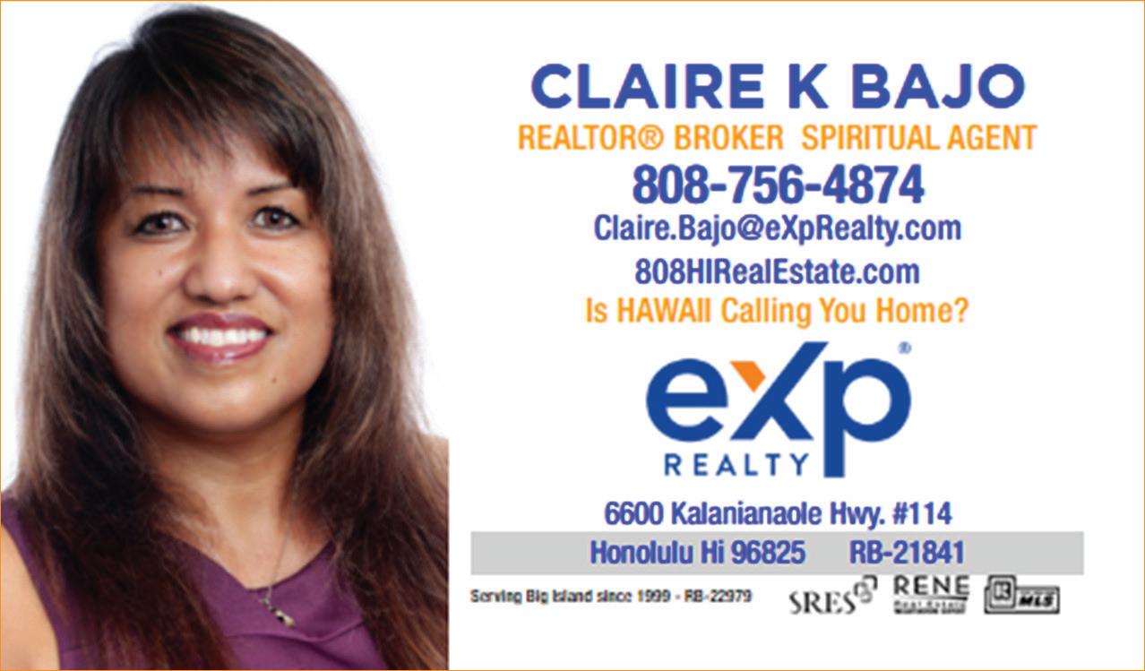Certified Real Estate Brokerage Manager (CRB) | Professional Mgmt. Accredited Buyers Representave (ABR) | Qualifying Buyers for Sellers Senior Real Estate Specialist (SRES) | Sellers Representave Specialist (SRS) Real Estate Negoaons Expert (RENE) | Negoang for Sellers & Buyers 2025-2024 Real Estate Business Instute (REBI) Hawaii Chapter, Treasurer 2025-2023 Connecng Consciousness (CC), Event Host, Volunteer Member 2025-2005 LEMURIA Expert | Reincarnated Souls Called to Hawaii SERVING BIG ISLAND OF HAWAII SINCE 1999 | Over 33 Years in the Industry