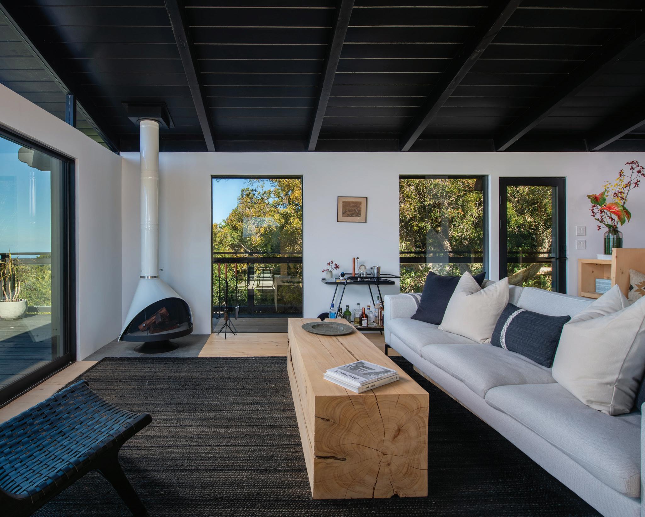 The interiors feature yellow cedar flooring, custom cabinetry, and handcrafted furnishings throughout, including a substantial cedar dining table designed by Jorgensen. A restrained palette defines the main living spaces, while black-painted ceilings were used to minimize glare and preserve views of the night sky.