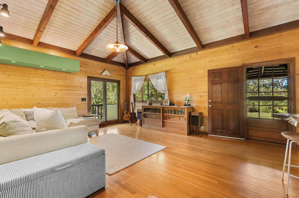 The main acre features 2 distinct living spaces. The primary residence is a custom one-bedroom, one-bath post & pier house showcasing open-beam ceilings, white oak floors, mango wood countertops, wood-framed windows/sliding glass doors, & wrap-around lanai. There is also a charming ohana-style dwelling with half bath & outdoor shower. Originally designed as an office/workshop, it easily serves as guest accommodation. Completing this portion of the property is an above-ground pool with Trex decking, lush lawn, & an abundance of mature fruit trees including citrus, coconut, avocado, rambutan, lychee, starfruit, soursop, white pineapple & breadfruit.