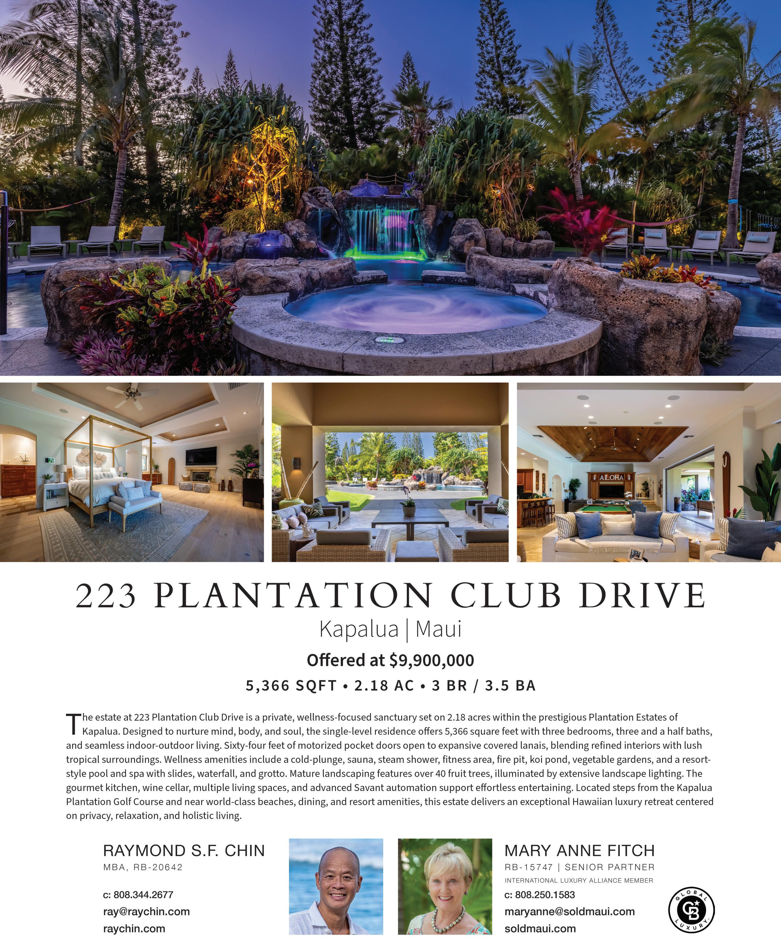 3 BEDS | 3 BATHS | 3,354 SQFT | $5,200,000 . Breathtaking panoramic ocean views welcome you to 232 Crestview Road in the prestigious gated community of Pineapple Hill Estates at Kapalua. This luxurious single-level home offers 3,354 square feet of interior living space on a spacious half-acre lot, ideally situated at the end of a quiet cul-de-sac between two vacant lots for exceptional privacy and potential expansion. The residence features three bedrooms, three bathrooms, and a bonus room next to the two-car garage. Thoughtfully designed living areas open seamlessly to expansive lanais. Highlights include a designer walk-in closet in the primary suite, Jacuzzi soaking tub, fireplace, stateof-the-art appliances, Ubatuba granite countertops, cherry wood cabinetry, and elegant finishes throughout. Outdoor living features a lap pool and spa with imported Swiss Monier tile for a true resort-style setting. Recent upgrades include a new AC system and Lutron Smart Home system installed in 2025. Residents enjoy exclusive access to a private clubhouse, pool, tennis and pickleball courts. Located near Kapalua’s Plantation Golf Course, scenic trails, five-star resorts, and renowned dining. Offered fully furnished.