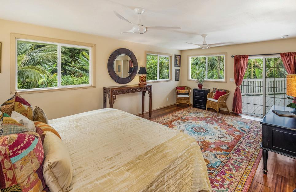 The land itself is equally compelling—mature areca palms provide complete perimeter privacy, while established grounds feature a fenced garden, fire pit, and a wide variety of fruit trees supported by multiple microclimates. This is not a speculative build. It is a residence shaped over time—by hand, by land, and by a clear architectural vision.