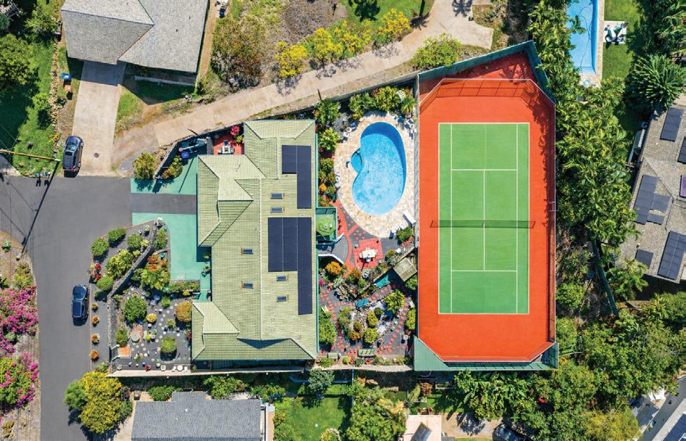 A treasure chest of wonder can be yours in this enchanting Maui Meadows Crown Jewel. Perched at the crest of a quiet cul-de-sac, offering unmatched privacy, this panoramic estate offers a masterclass in island living, and rarely found in South Maui. Unobstructed Ocean, Haleakala and Molokini and the outer island views. Situated on a pristinely manicured half-acre, the property is one of a select few featuring a private, professional-grade tennis court alongside an 11-foot deep custom pool adorned with a variety of sculptures. The main residence boasts three spacious en-suite bedrooms, a gourmet custom kitchen featuring rich Koa wood cabinetry and elegant Parquet flooring, and wrap-around lanais designed to capture unobstructed ocean and Haleakala views. Inside, the home features motorized skylights and vaulted ceilings which invite natural light and gentle breezes. Wander through Zen-inspired Japanese gardens complete with Koi ponds and stone bridges. Whether you are creating in the large art studio or entertaining on the expansive wrap-around deck, every corner of this half-acre property feels like a getaway. With a beautiful tile roof (2010), new 33 panel grid-tied photovoltaic system with tesla battery backup (leased), two-car garage, solar hot water, outdoor shower, ample storage, this estate blends timeless island elegance with practical design for tropical living.