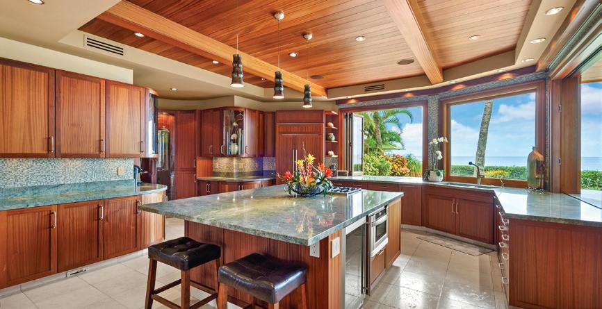 The chef’s kitchen and dining area showcases Sepalle wood detailing and striking Labradorite granite countertops, blending warmth with sophistication. The primary suite is a sanctuary, complete with a spa-inspired bath featuring a floating tub, private sundeck, and panoramic Haleakala views. Throughout the property, incredible details and textures create a custom, curated feel. Meticulously rebuilt in 2013 to combine modern structural capability with an irreplaceable oceanfront location, this legacy beachfront estate represents a rare and irreplaceable offering on Maui.