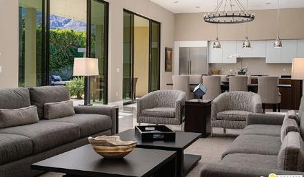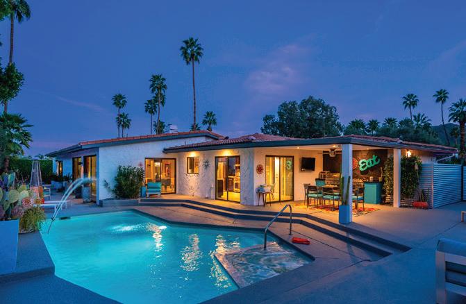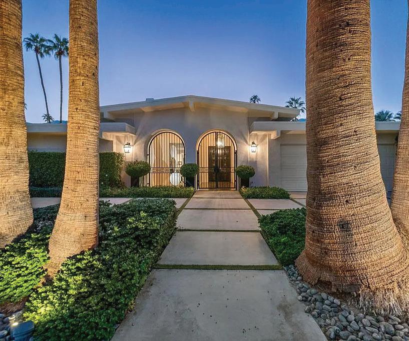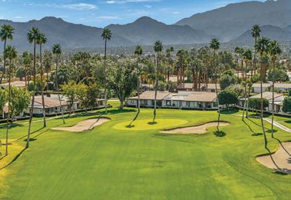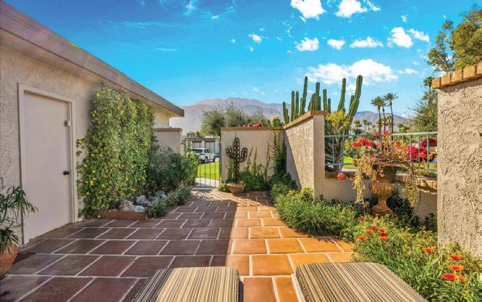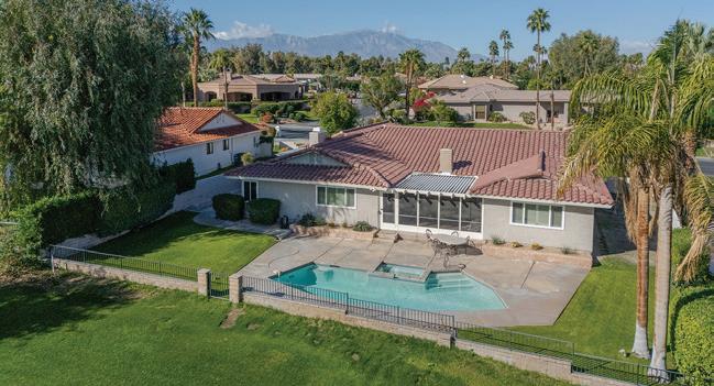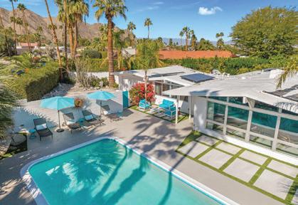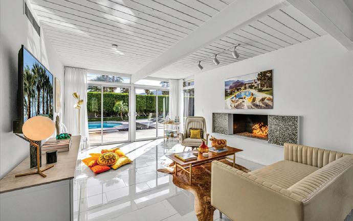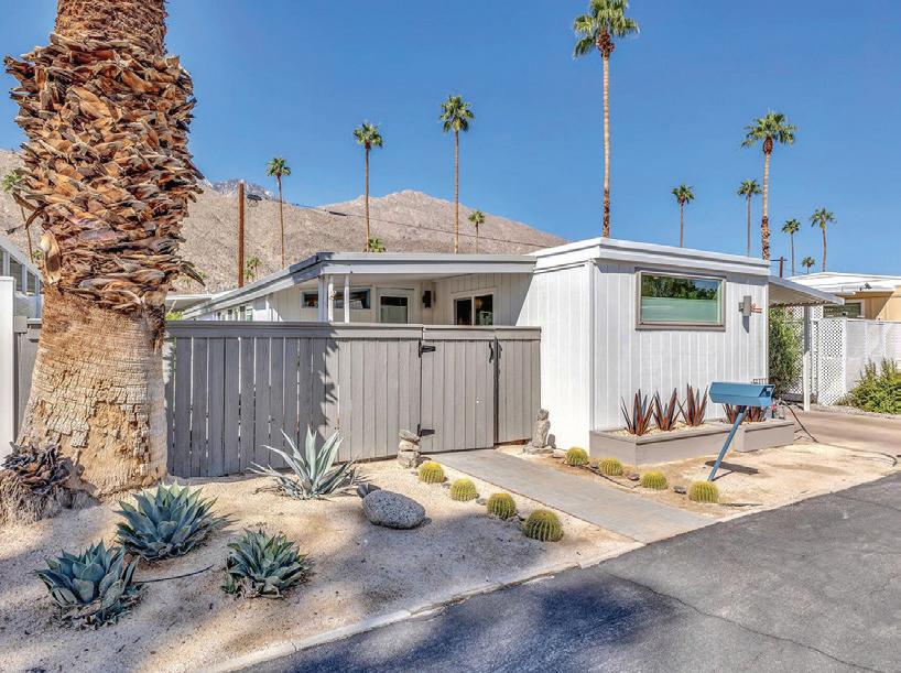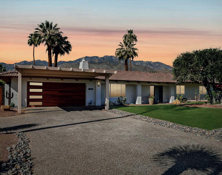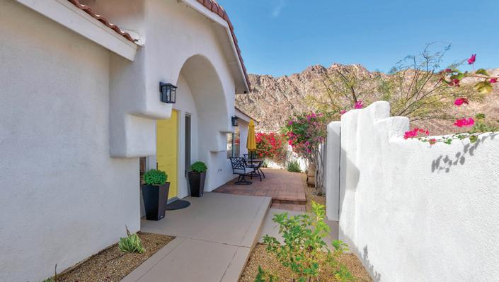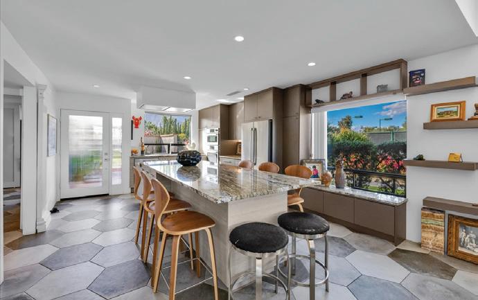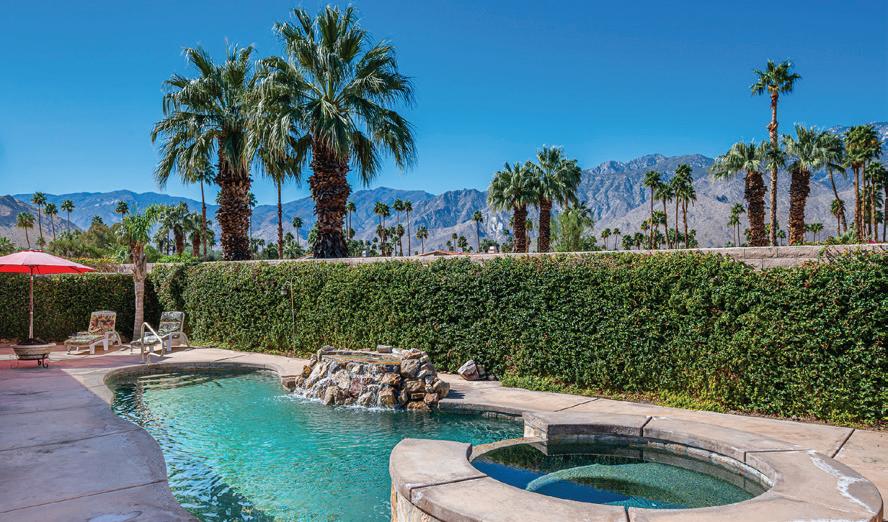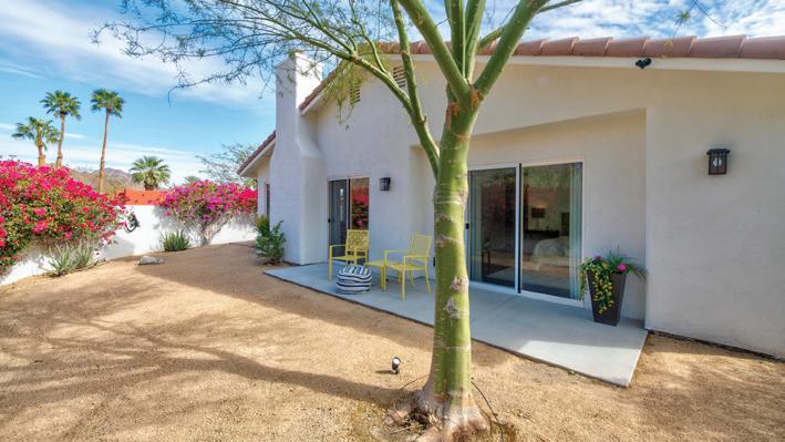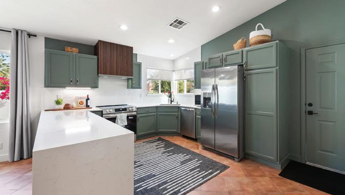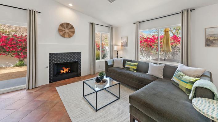 Experience the pinnacle of Palm Springs living in this meticulously reimagined 1,252-square-foot residence. Every inch of this single-level, twobedroom, two-bath home has been transformed with luxury materials and thoughtful attention to detail. The open-concept layout is centered around a show-stopping Chef’s kitchen, anchored by a 12-foot granite waterfall island with ample integrated storage, top-of-the-line Bosch stainless steel appliances, and a professional Zephyr range hood. Custom cabinetry with dovetail and soft-close finishes provides a sophisticated, tailored feel. From sunset cocktails to gourmet dinner parties, this Chef’s kitchen blends high-design aesthetics with pro-grade performance for a truly elevated entertaining experience. The interior is bathed in light by added clerestory windows and premium Milgard energy efficient windows and doors. Porcelain tile floors flow seamlessly into the bathrooms, which feature custom tile work and lighted vanity mirrors. Additional upgrades include Bali Blinds, custom California Closets, Pelican water filtration system, a 16 Seer Rheem HVAC unit and recessed lighting. Enjoy true indoor-outdoor living from the front and back patios with hand-laid Saltillo tiles and breathtaking panoramic mountain views. Positioned on an incredible interior lot on a quiet cul-de-sac by the pond, bridge and walkways, you are just steps from one of the desert’s most beautifully landscaped gated enclaves. A MASTERPIECE