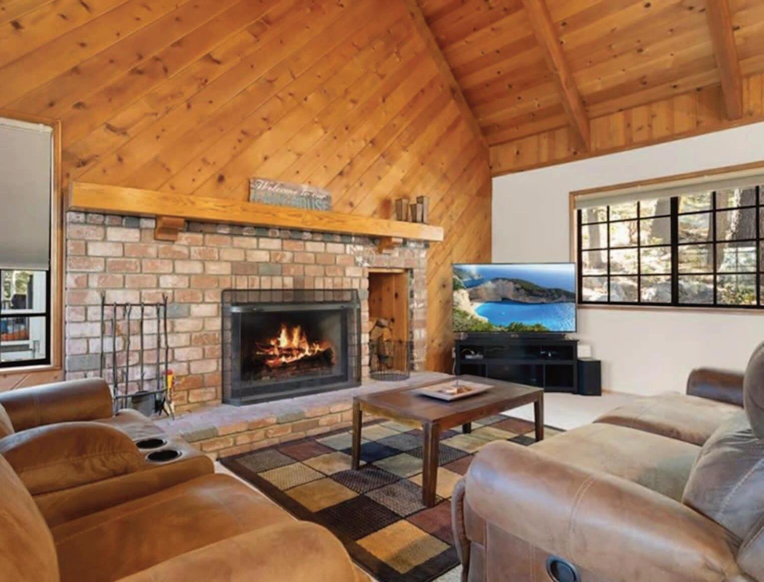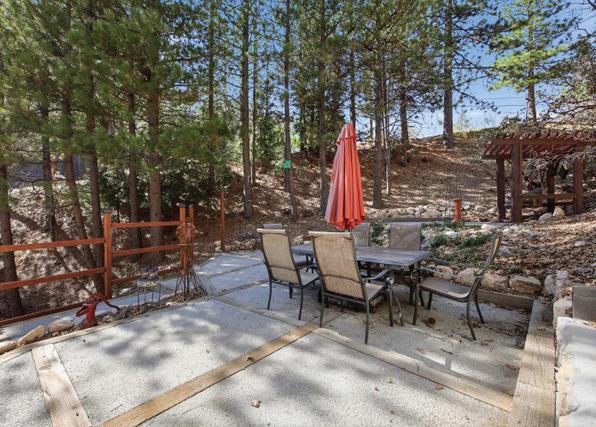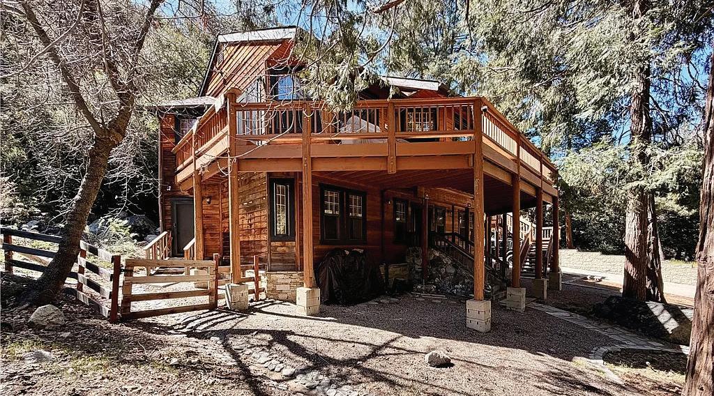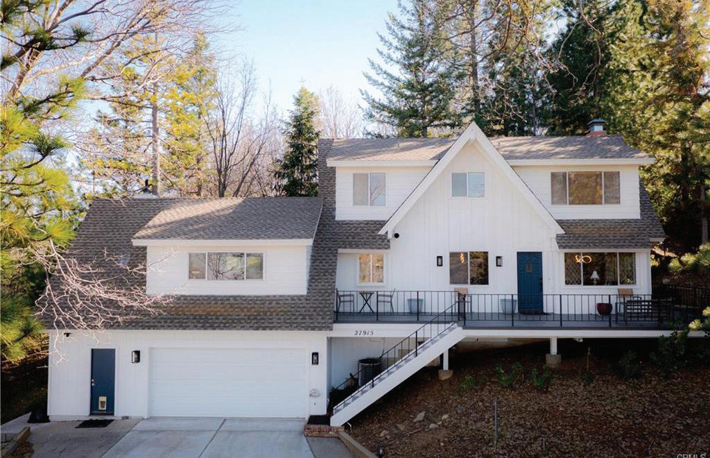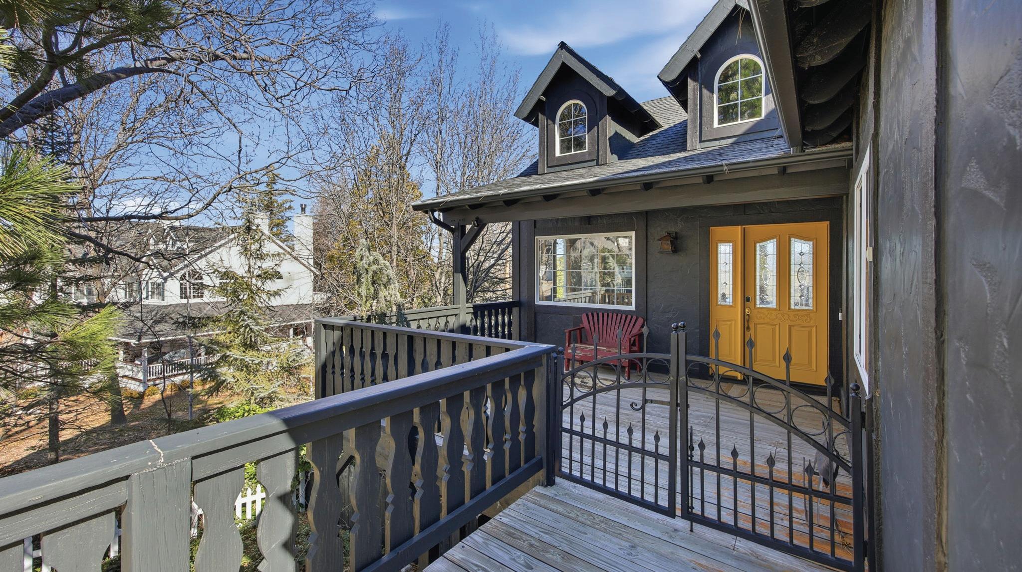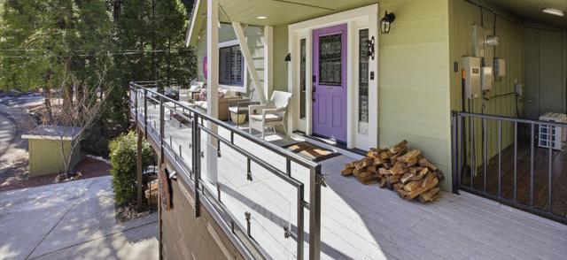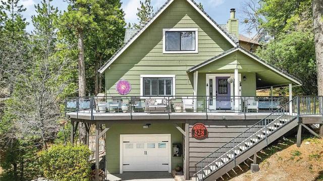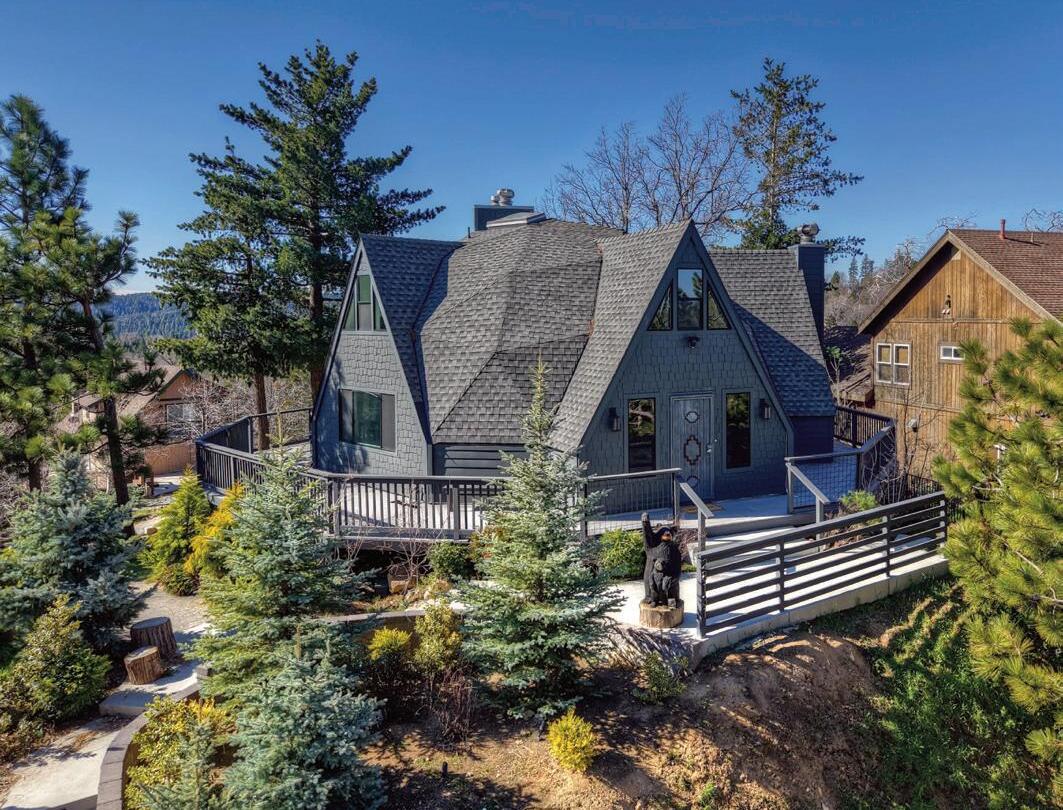 Located near Grass Valley Lake in Lake Arrowhead, this distinctive corner-lot property sits across from a scenic forest trailhead and offers a blend of modern design and mountain charm. The sage green modified A-frame features dormers, a striking portico, and a full wraparound Trex deck with powdercoated aluminum and tempered glass railings, plus two additional back decks for outdoor enjoyment. Inside, the open-concept main level showcases a spacious living room with a modern horizontal stone fireplace, family-style dining area, and a gourmet kitchen with quartz counters, bar seating, island, custom cabinetry, and white brick accents. The layout flows seamlessly to the deck and landscaped backyard with winding paver paths.