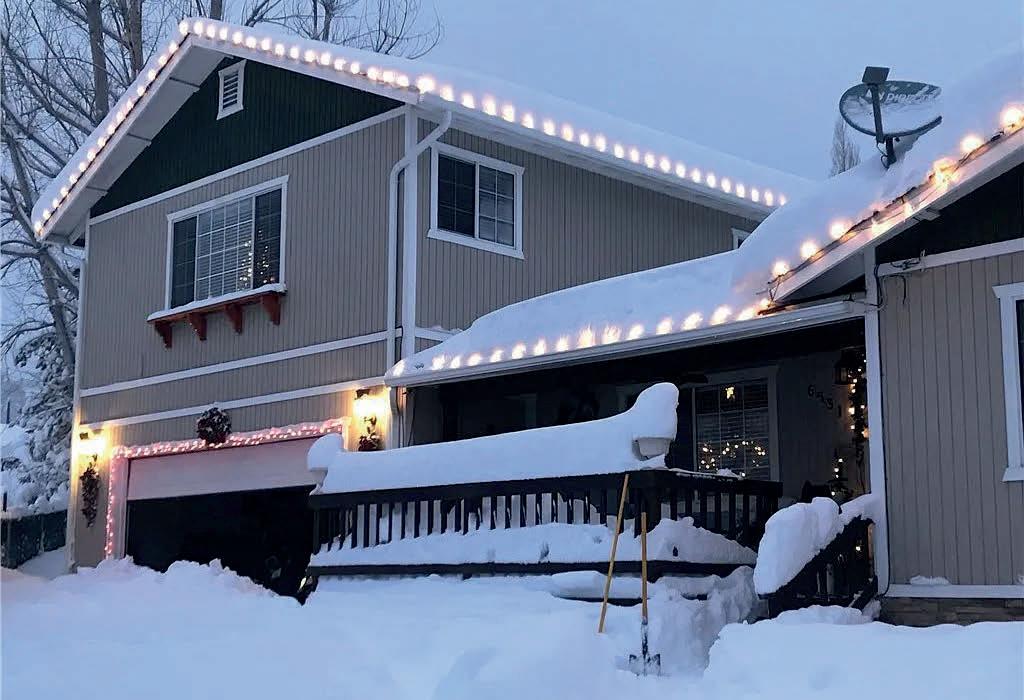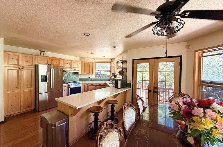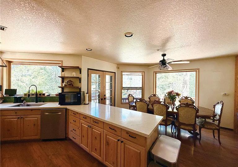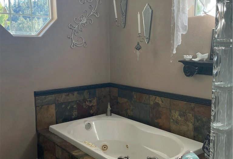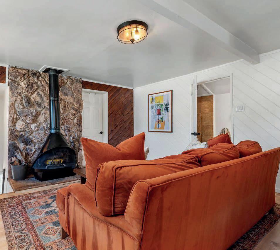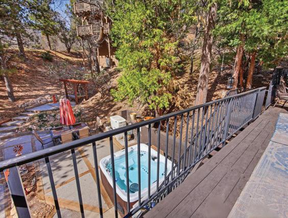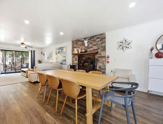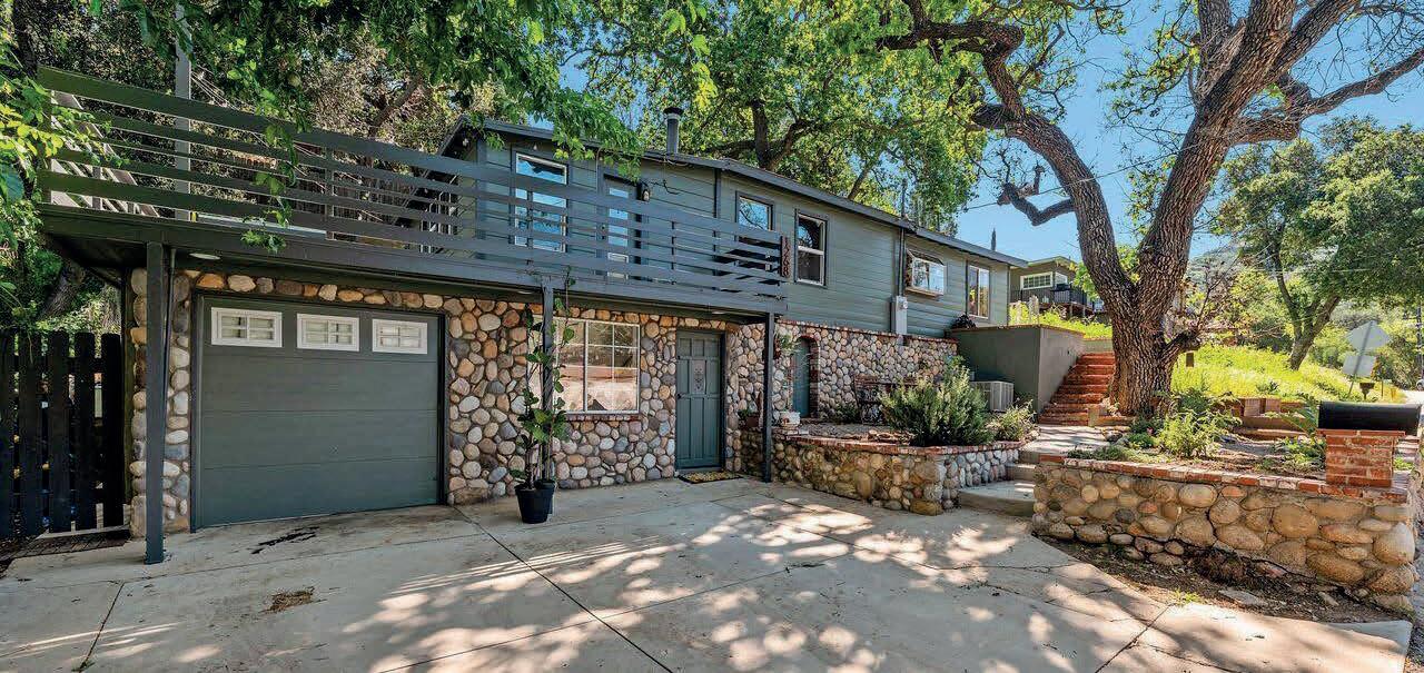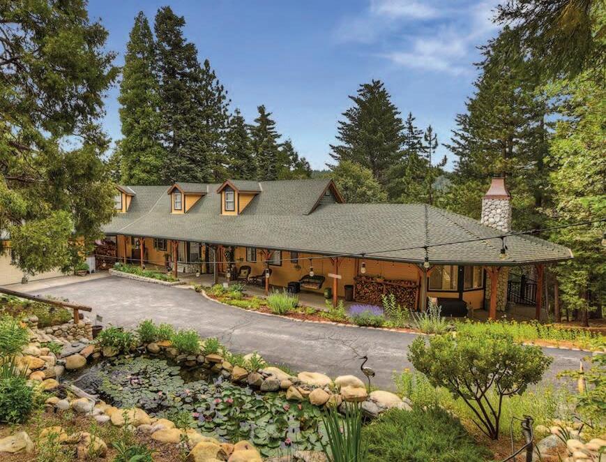 Located near Grass Valley Lake in Lake Arrowhead, this distinctive corner-lot property sits across from a scenic forest trailhead and offers a blend of modern design and mountain charm. The sage green modified A-frame features dormers, a striking portico, and a full wraparound Trex deck with powdercoated aluminum and tempered glass railings, plus two additional back decks for outdoor enjoyment. Inside, the open-concept main level showcases a spacious living room with a modern horizontal stone fireplace, family-style dining area, and a gourmet kitchen with quartz counters, bar seating, island, custom cabinetry, and white brick accents. The layout flows seamlessly to the deck and landscaped backyard with winding paver paths.