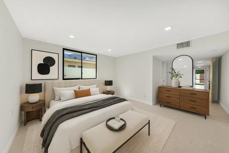 Stunning Los Compadres retreat just two blocks from CV LINK. Enter through a lush courtyard into a light-filled home with vaulted ceilings, travertine floors, and walls of glass showcasing mountain views. Designed for entertaining, enjoy a sunken living/dining room, cozy family room, game room, and a 12’ full-service bar opening to a resort-style backyard with pool, spa, outdoor kitchen, and bocce court. The chef’s kitchen features Electrolux ICON appliances, gas cooking, and a walk-in pantry. The luxurious primary suite offers vaulted ceilings, spa bath, custom closet, and home gym, plus three additional bedrooms and office. Fee simple land, 34 owned solar panels, and a finished two-car garage complete this Palm Springs oasis.