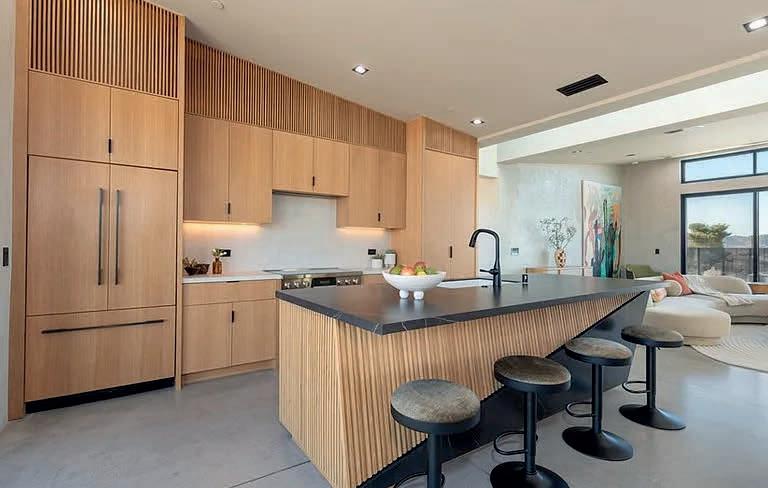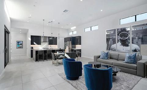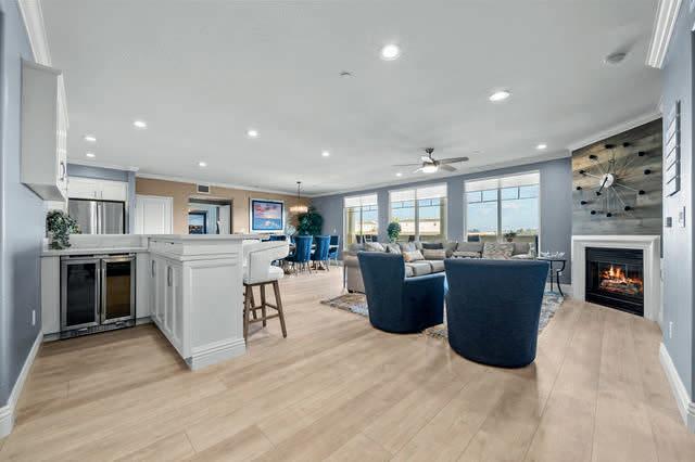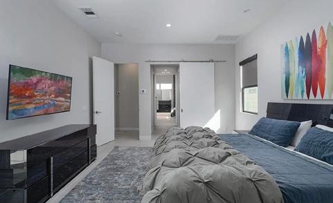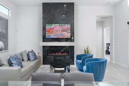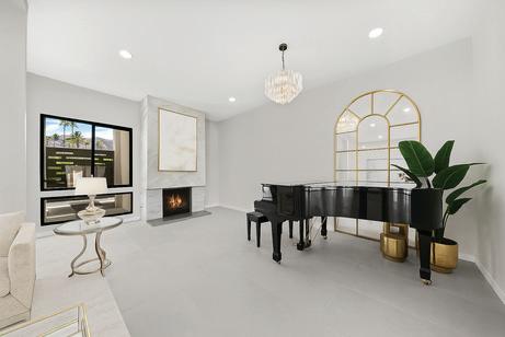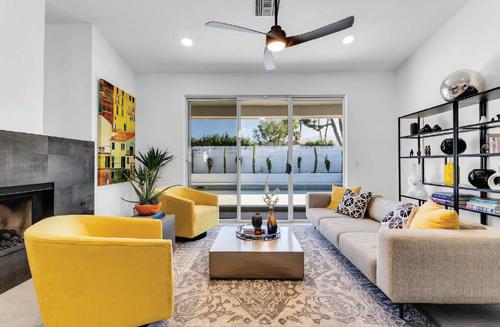 Take advantage of an all new price on an exceptional contemporary property in downtown Palm Springs. Thoroughly upgraded, find a three-bedroom+den (currently an office), three-bath home at VUE where design continuity is key. From the start, the oversized flooring tile and countertop finishes extend throughout, lending this property a serene harmony, and as you enter the home, a striking chandelier hovers high above the light dappled formal entry where first up is a main floor guest bedroom with ensuite bath, and a custom glass enclosed office that is easily converted to a 4th bedroom. The design opens seamlessly to a light-filled main living area and gourmet kitchen with entertaining in mind, a large island with ample bar seating, high-end Thermador appliances, and in service of meal preparation, fully filtered and softened water whole-housewide. On the topic of entertaining, the adjacent dining area can accommodate a dinner party for 10, and then, dessert afterwards, in the attractive living area anchored by a modern fireplace tiled to the ceiling.