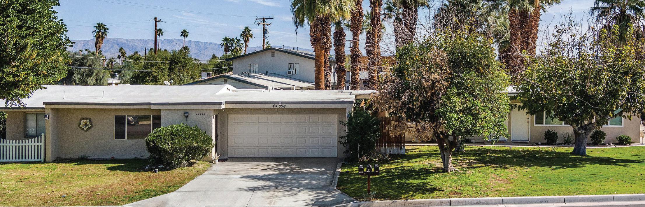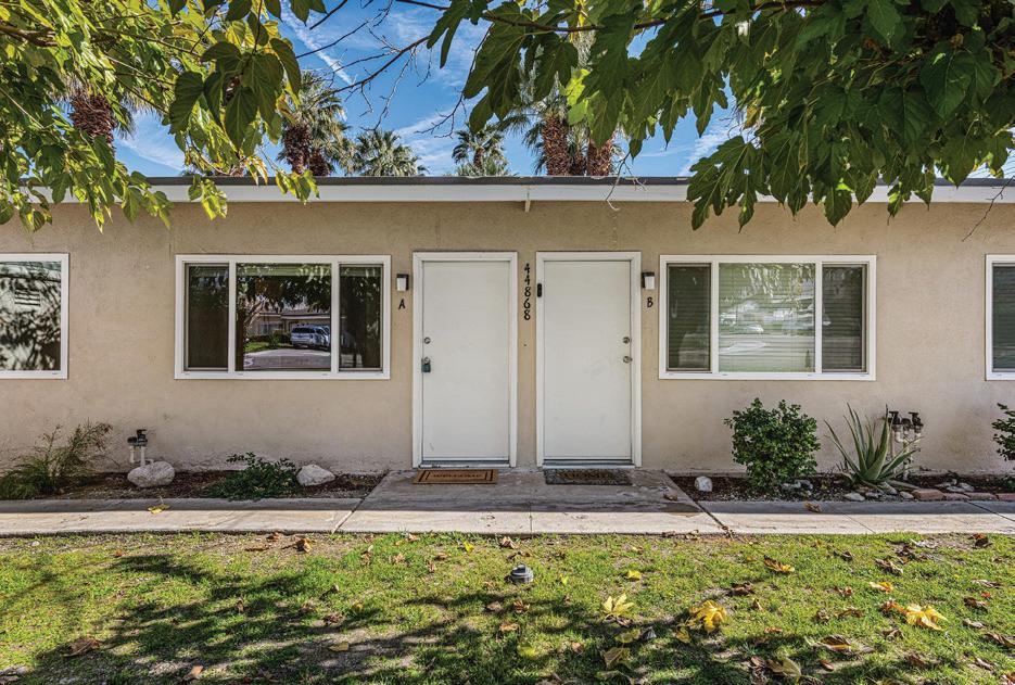 Opportunity situated on a large corner lot with three total income units—a single-family residence plus a separate duplex. The 3-bedroom, 2-bath home is approx. 1,528 sq. ft., and is currently leased. The home offers the privacy and functionality of a standalone residence with a spacious living room, separate kitchen and dining area, private fenced backyard with swimming pool. Features include custom birch cabinetry, Corian countertops in the kitchen and bathrooms. The interior and exterior have been painted recently, and a new roof installed in 2024. The duplex consists of two 2-bedroom, 1-bath units which are approx. 759 sq. ft. each. Both units have new HVAC systems installed in 2025. Unit 1 has been extensively updated and features new windows, new interior and exterior paint, vinyl plank flooring throughout with the exception of the bathroom, all-new kitchen cabinetry and countertops, updated plumbing fixtures and electrical outlets/switches, new stove and hood, tiled shower/tub, new vanity and sink, and window treatments. Unit 2 is currently leased and offers new carpeting, granite kitchen counter tops, new stove and hood, updated sink and fixtures, and window blinds. Additional highlights include new roofing on both the house and duplex in 2024. Ideally located just minutes from El Paseo, shopping, dining, retail, business centers, and College of the Desert.