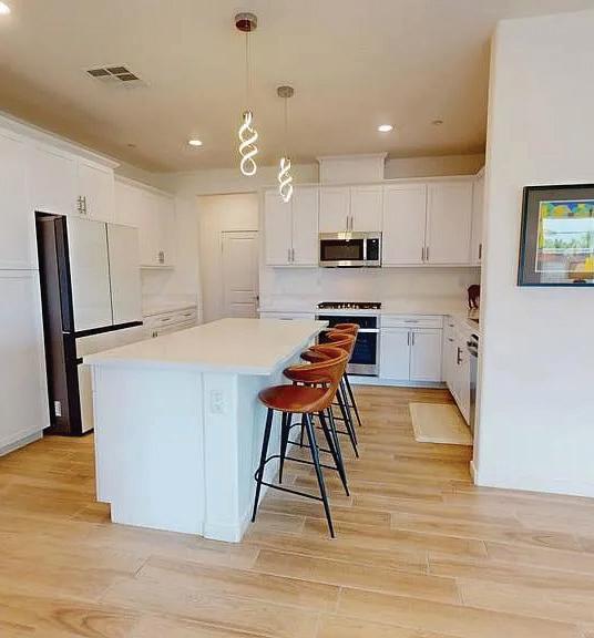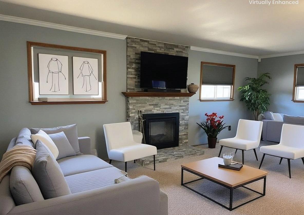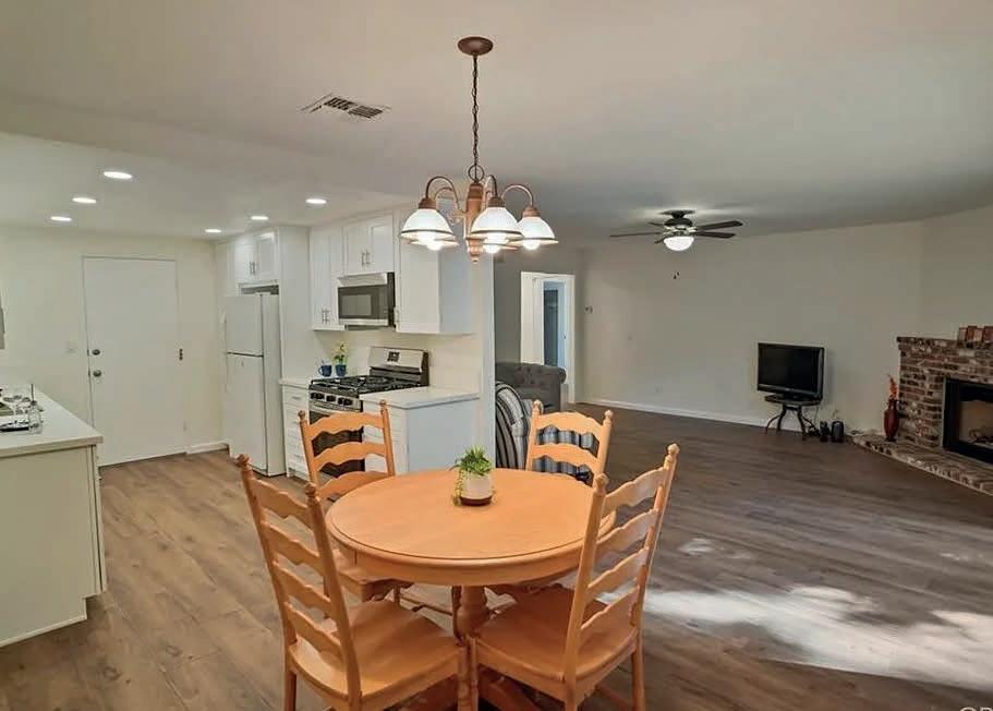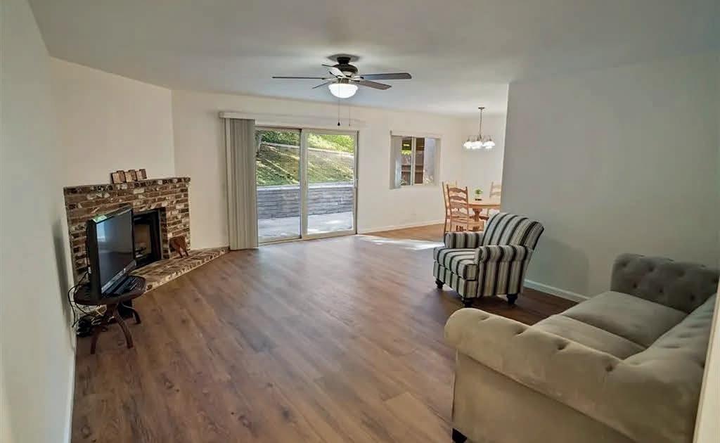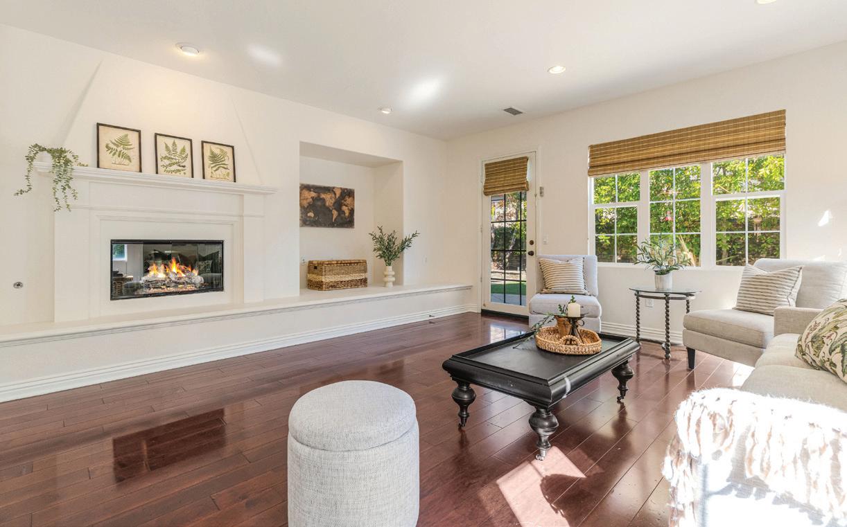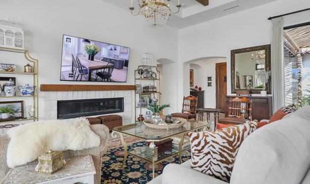 An open-concept living area with French doors, a fireplace centerpiece, and a chef’s kitchen with breakfast bar and walk-in pantry create the perfect flow for entertaining or quiet nights in. The primary suite offers patio access, a walk-in closet, and a spa-style bath with soaking tub and dual-head shower.