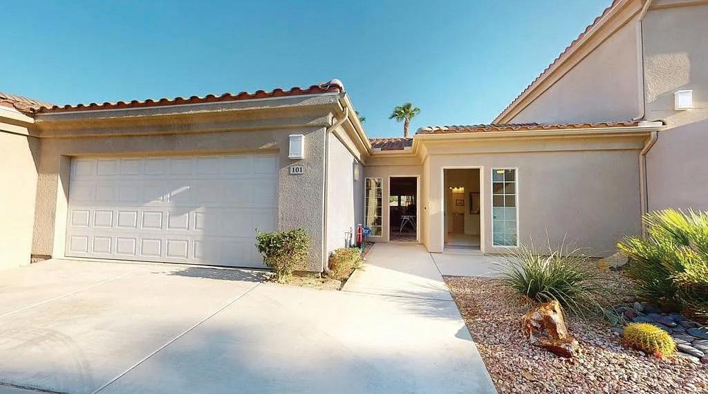 One bedroom, one bath lower-level condo with golf course, mountain and lake views. The condo has a stackable washer & dryer inside the condo and a one car garage. One of the community pools is right across the street. Palm Royale is a gated community within walking distance to Indian Wells Tennis Gardens. Unlimited golf is included in the HOA dues on the Ted Robinson designed par-3 golf course. This is the Valley's Premier Short Course! Clubhouse & Pro Shop. Minutes from destination golf, dining & shopping. Community amenities include 6 pools & spas, lighted pickleball and tennis courts and Helix Disc Golf. HOA fees also include basic cable, internet, landscape maintenance, & trash service.