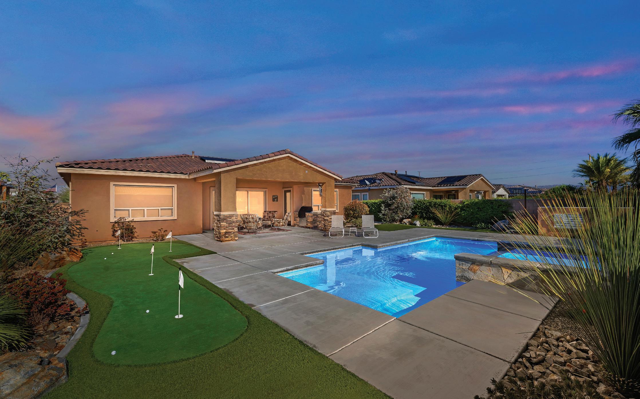 Stunning, immaculate home located on a quiet cul-de-sac in Encore, Palm Desert. This beautiful 2014-built single-story home has been highly upgraded and fully customized by the original owner. Special features include pool and jacuzzi with sun shelf, putting green, built-in BBQ, custom wall treatments in great room, full bar, sound system throughout, kitchen island and much more.