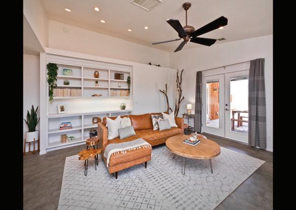 Outdoors, relax beneath the shaded pergola, stargaze from the cowboy tub, or lounge in the custom hammock zone. A rustic corrugated-metal gate encloses a defined 1.5-acre area within the fully fenced property — ideal for pets, play, and desert serenity amid mature and preserved Joshua Trees.