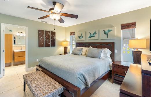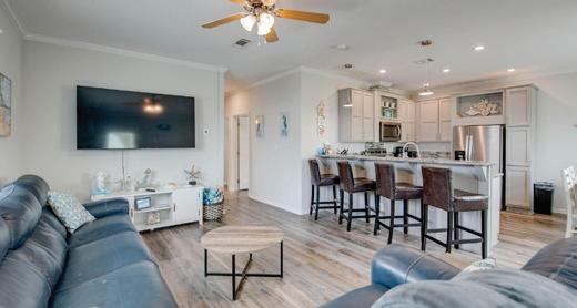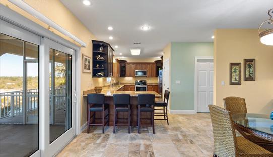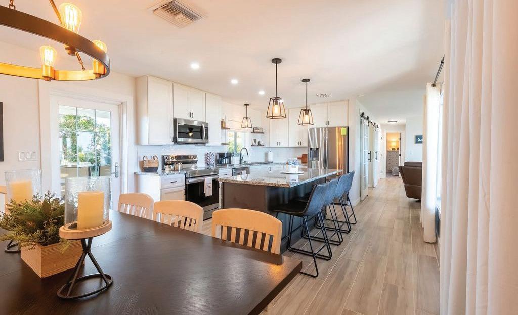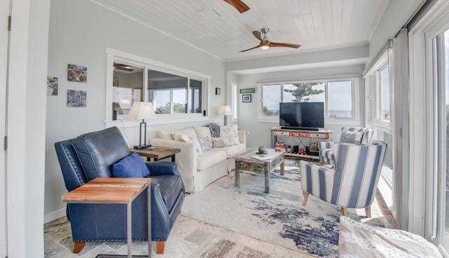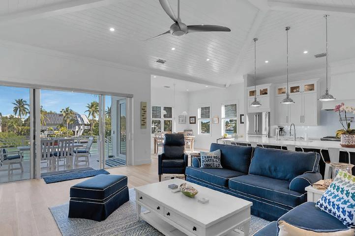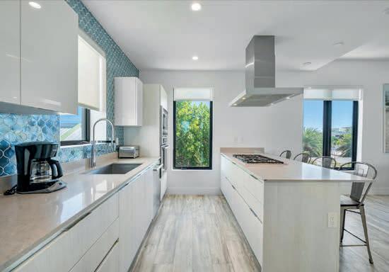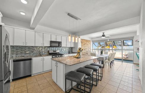 Each bedroom features a king bed and terrace access, while the primary suite includes a spa-inspired bath. The sleek kitchen is fully outfitted with premium appliances, ideal for effortless entertaining. Outdoor terraces invite relaxation, with a new pool and a private dock for swimming and kayaking.