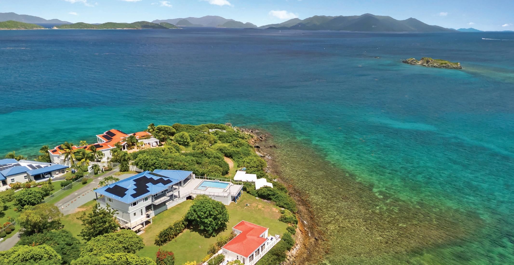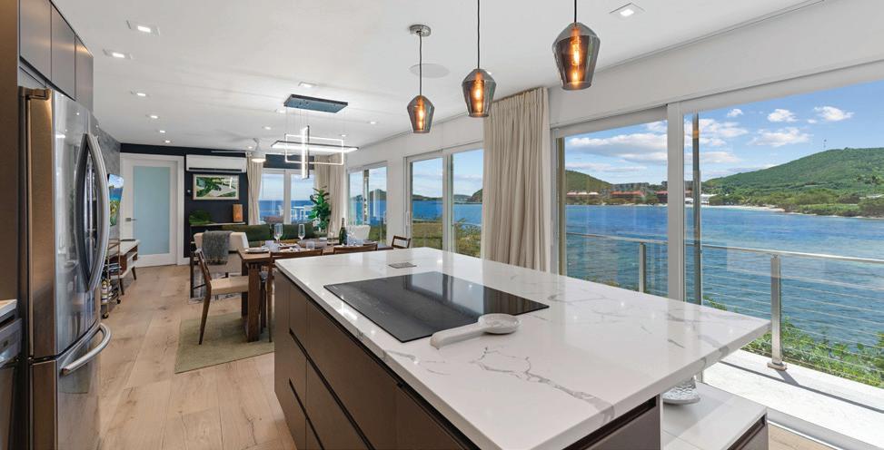 Set on a private half acre lot in prestigious Pelican Point, the property offers 140 feet of direct water frontage with panoramic views of Pelican Beach, Sapphire Beach, St. John, and the surrounding Cays. Floor-to-ceiling glass doors open to the sea, filling the home with light and coastal breezes.