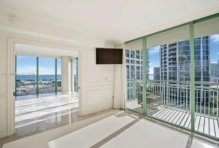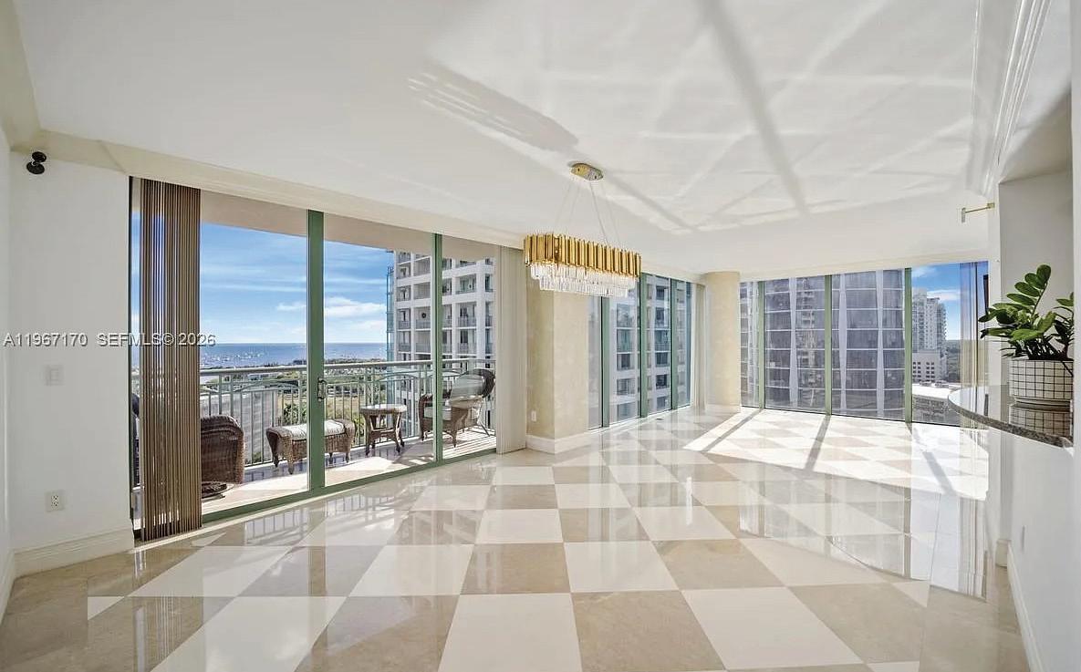 skyline views, ten-foot ceilings, neutral marble floors, renovated chef’s kitchen, open airy layout, resort-style living, and second bedroom configured as a den for flexibility with luxury vacation feel.