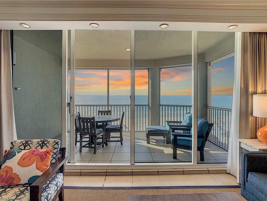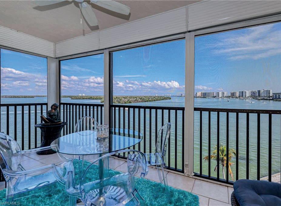 180o VIEW OF ESTERO BAY from this fourthfloor condo at Windward Point. Experience a cruise-ship-view of mangrove islands, playful dolphins and passing boats! New flooring and painting throughout the unit. New kitchen cabinets, SS appliances, gorgeous quartz countertops, two lazy Susans for extra storage and decorative lighting over the bar. There is a white leather sofa with builtin recliners and two leather reclining chairs in the living room. Balcony table and chairs plus two wicker chairs with ottomans. It’s the perfect place to have dinner or just relax and take in the view!