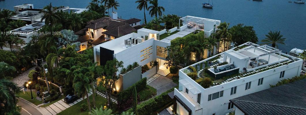 This sleek ultra-modern tri-level waterfront masterpiece is perfectly situated on the coveted tip of Hibiscus Island, offering breathtaking, unobstructed views of the bay, yachts, and the Miami skyline. Designed by renowned architect Roney Mateu of Mateu Architecture, the home features porcelain and oak wood floors, open living spaces, a gourmet kitchen with top appliances, a custom bar, movie theatre with leather recliners, gym, and outdoor kitchen. All bedrooms offer water-view balconies. Outdoor amenities include a heated infinity-edge pool, Jacuzzi with fire pit, summer kitchen, cabana bath, private dock with boat lift, and 85 feet of waterfront. A rooftop entertainment lounge delivers 360° panoramic views, making this residence the ultimate Miami lifestyle experience.