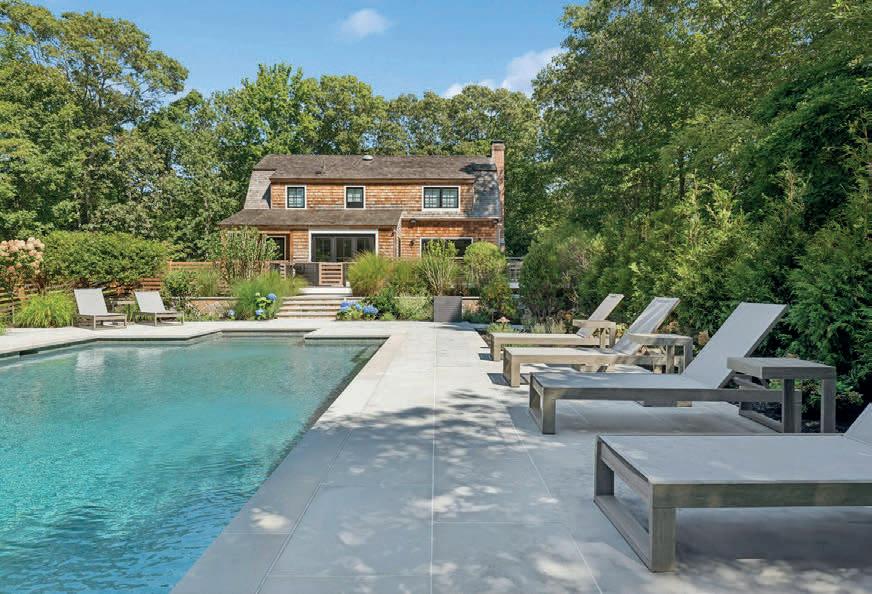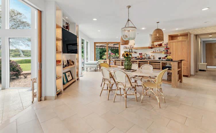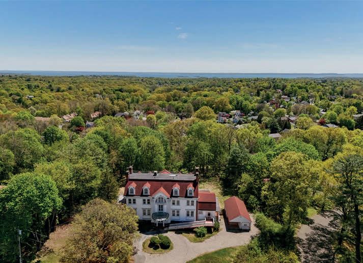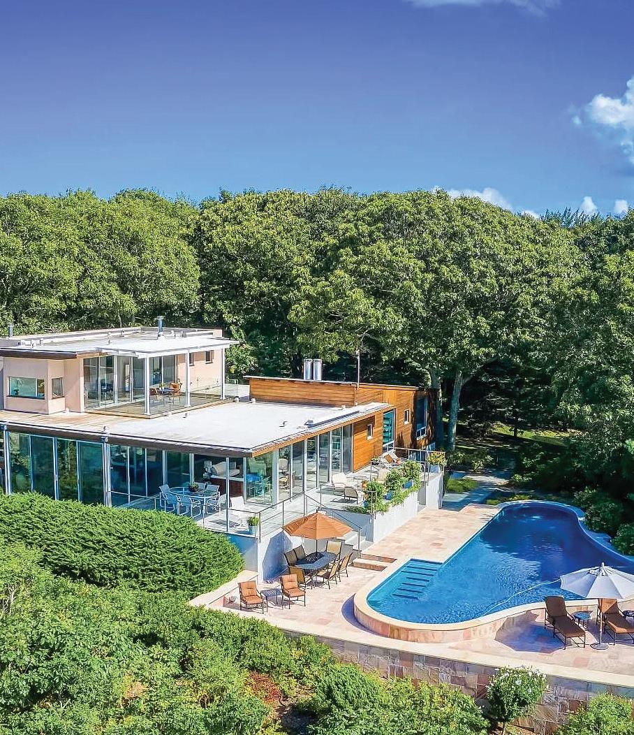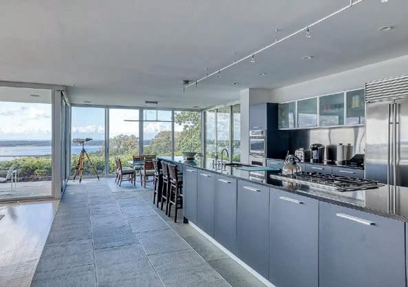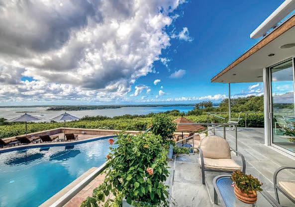 Built in 2002, “Treetops” is an AIA Archi Award-winning modern classic that boasts some of the most sweeping and unobstructed views on Eastern Long Island-stretching across the North Fork, Peconic Bay, Long Island Sound, and reaching to Connecticut. Positioned at 162 feet above sea level on “Divinity Hill” in Shelter Island Heights, it sits at one of the island’s highest natural elevations. The home is the result of a thoughtful evolution of an original design by Peter Schladermundt, renowned for his iconic structures at the 1964 New York World’s Fair, brought to its current form by noted architect Frederick Stelle. The architectural concept centers around two clean-lined volumes joined by a glass pavilion, using a restrained palette of stone, steel, and glass, executed with clarity and elegance. On the viewfacing side of the home, a dramatic pavilion wrapped in 9-foot floor-toceiling glass walls provides unobstructed vistas. These are framed with anodized aluminum windows, hand-laid aluminum inlay mouldings, and solid core doors that reflect the home’s refined craftsmanship. The main living area is open, featuring a fireplace, radiant heat floors, a screened dining area, and access to two decks, one with a built-in barbecue. An elevated kitchen is outfitted with Poliform cabinetry, high-end appliances, and a butler’s pantry. Additional spaces on this level include a family room with Scandinavian fireplace, powder room, laundry, office/library, and a first-floor en-suite guest bedroom. A sculptural bluestone staircase, with treads subtly suspended one inch from a glass wall, rises beside 19-foot acid-etched glass windows, filtering natural light through the space, offering a graceful ascent to the primary en-suite bedroom. An aerie above the canopy of treetops, this suite features a covered rooftop terrace, steam shower, soaking tub, and a Scandinavian propane stove, offering a serene and secluded experience.