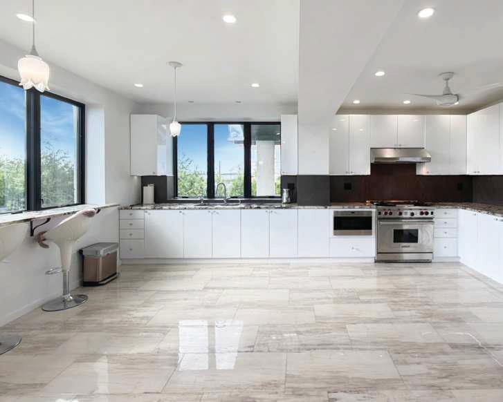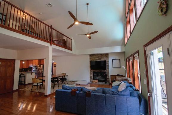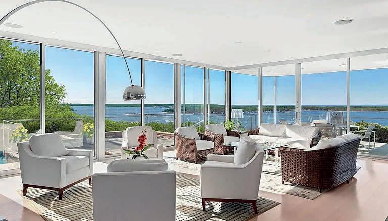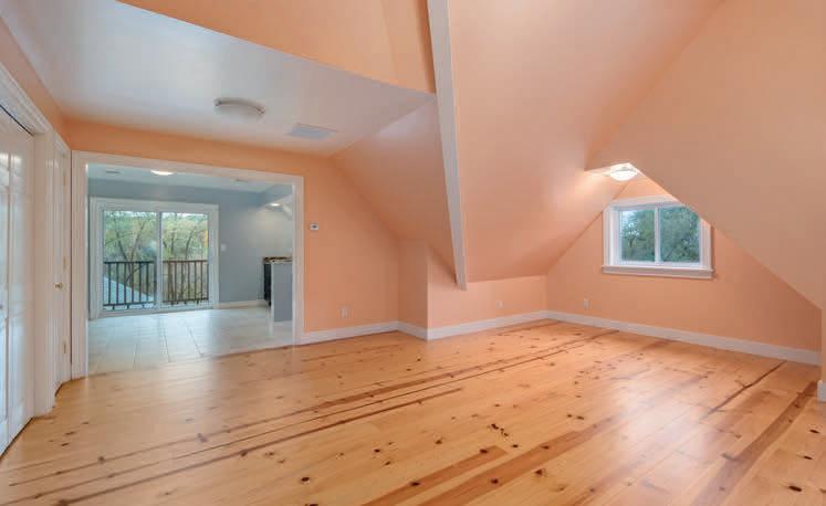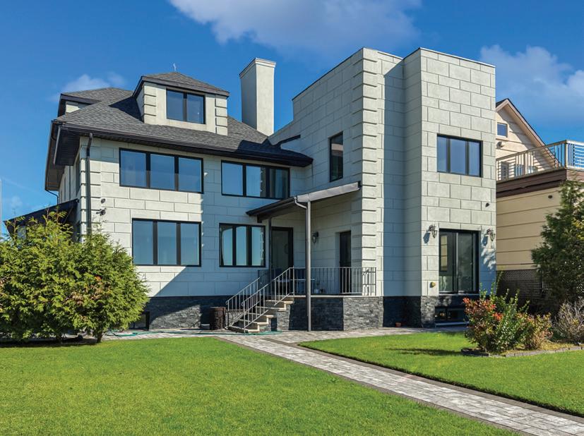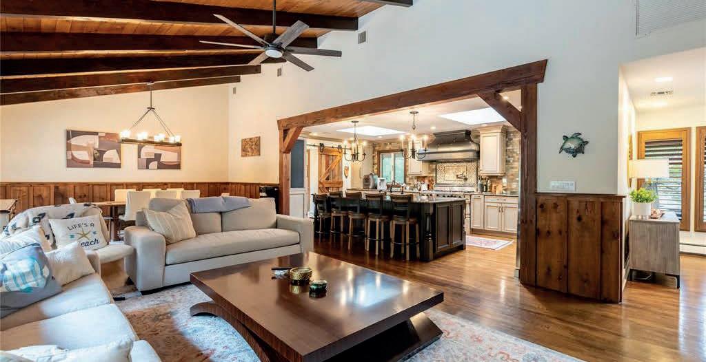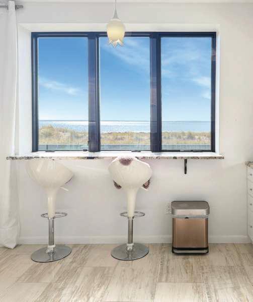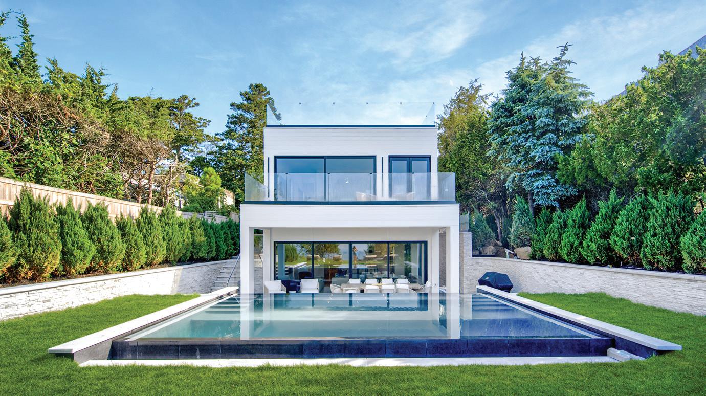 Built in 2002, “Treetops” is an AIA Archi Award-winning modern classic that boasts some of the most sweeping and unobstructed views on Eastern Long Island-stretching across the North Fork, Peconic Bay, Long Island Sound, and reaching to Connecticut. Positioned at 162 feet above sea level on “Divinity Hill” in Shelter Island Heights, it sits at one of the island’s highest natural elevations. The home is the result of a thoughtful evolution of an original design by Peter Schladermundt, renowned for his iconic structures at the 1964 New York World’s Fair, brought to its current form by noted architect Frederick Stelle. The architectural concept centers around two clean-lined volumes joined by a glass pavilion, using a restrained palette of stone, steel, and glass, executed with clarity and elegance. On the viewfacing side of the home, a dramatic pavilion wrapped in 9-foot floor-toceiling glass walls provides unobstructed vistas. These are framed with anodized aluminum windows, hand-laid aluminum inlay mouldings, and solid core doors that reflect the home’s refined craftsmanship. The main living area is open, featuring a fireplace, radiant heat floors, a screened dining area, and access to two decks, one with a built-in barbecue. An elevated kitchen is outfitted with Poliform cabinetry, high-end appliances, and a butler’s pantry. Additional spaces on this level include a family room with Scandinavian fireplace, powder room, laundry, office/library, and a first-floor en-suite guest bedroom. A sculptural bluestone staircase, with treads subtly suspended one inch from a glass wall, rises beside 19-foot acid-etched glass windows, filtering natural light through the space, offering a graceful ascent to the primary en-suite bedroom. An aerie above the canopy of treetops, this suite features a covered rooftop terrace, steam shower, soaking tub, and a Scandinavian propane stove, offering a serene and secluded experience.