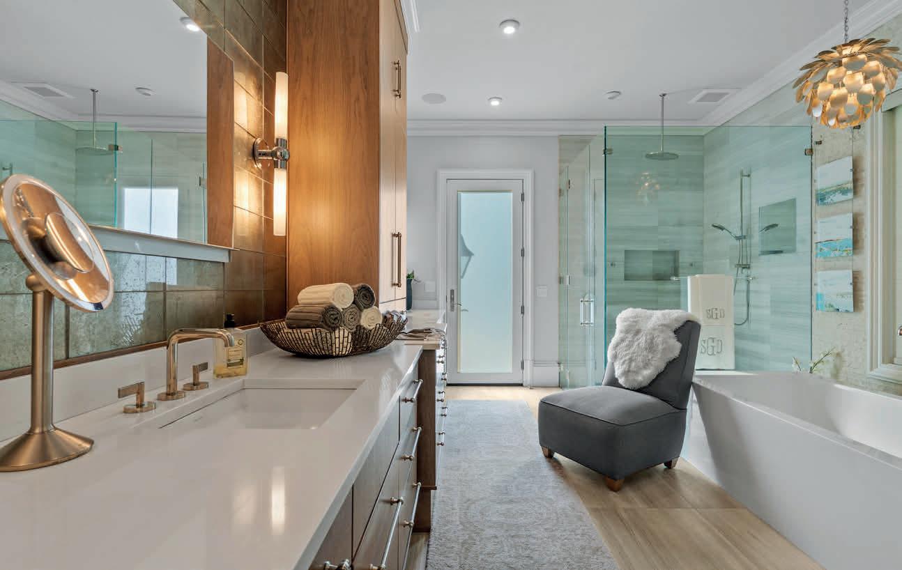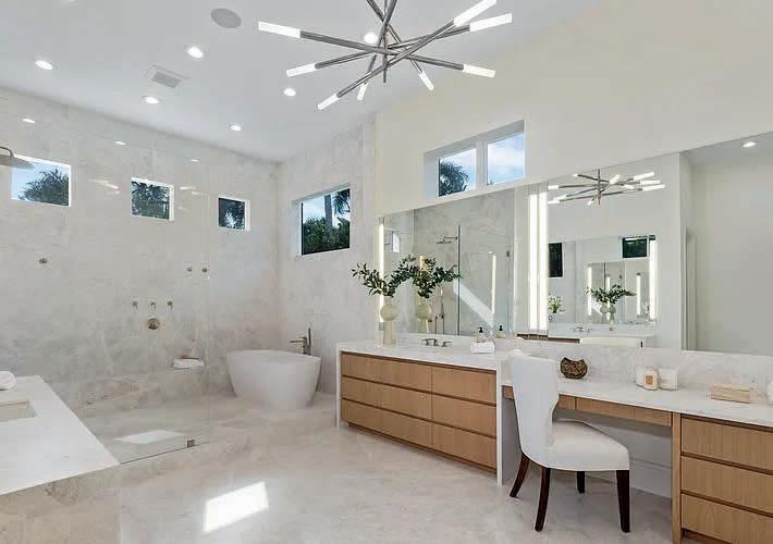 Lighting throughout the residence is controlled through a Ketra system by Lutron, allowing adjustment of brightness and color temperature throughout the day, including optional circadian lighting settings.