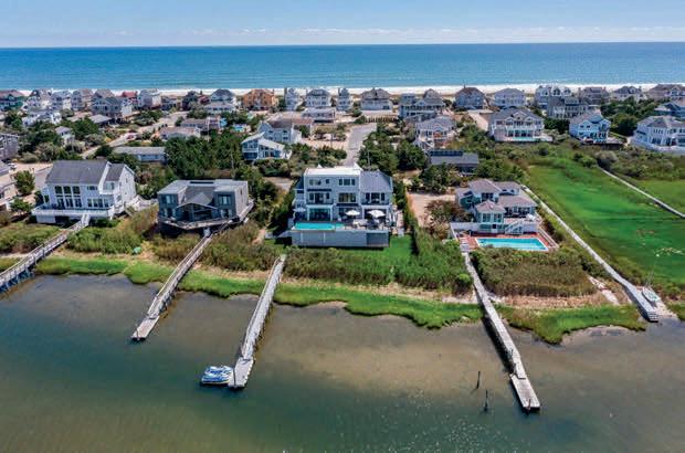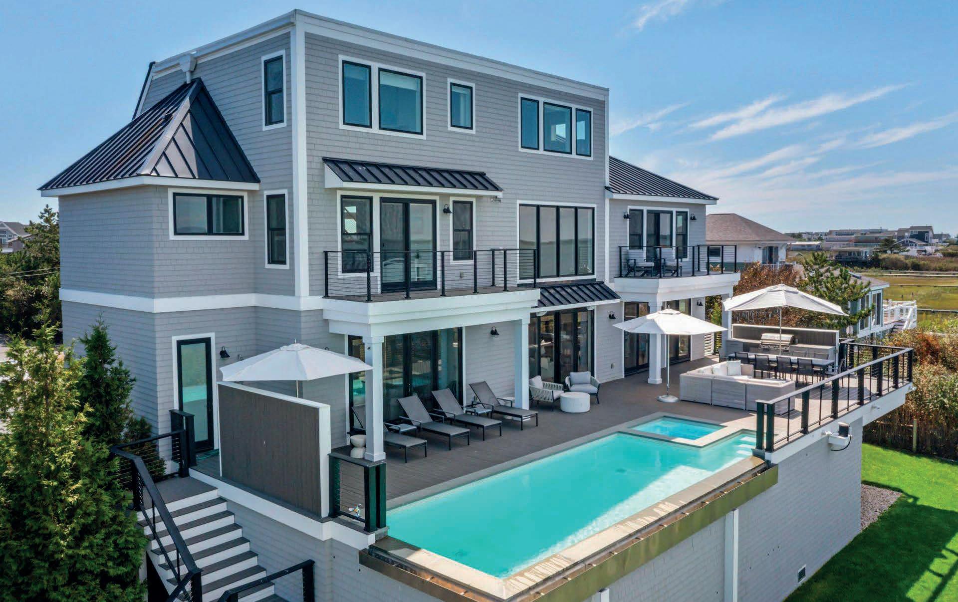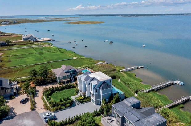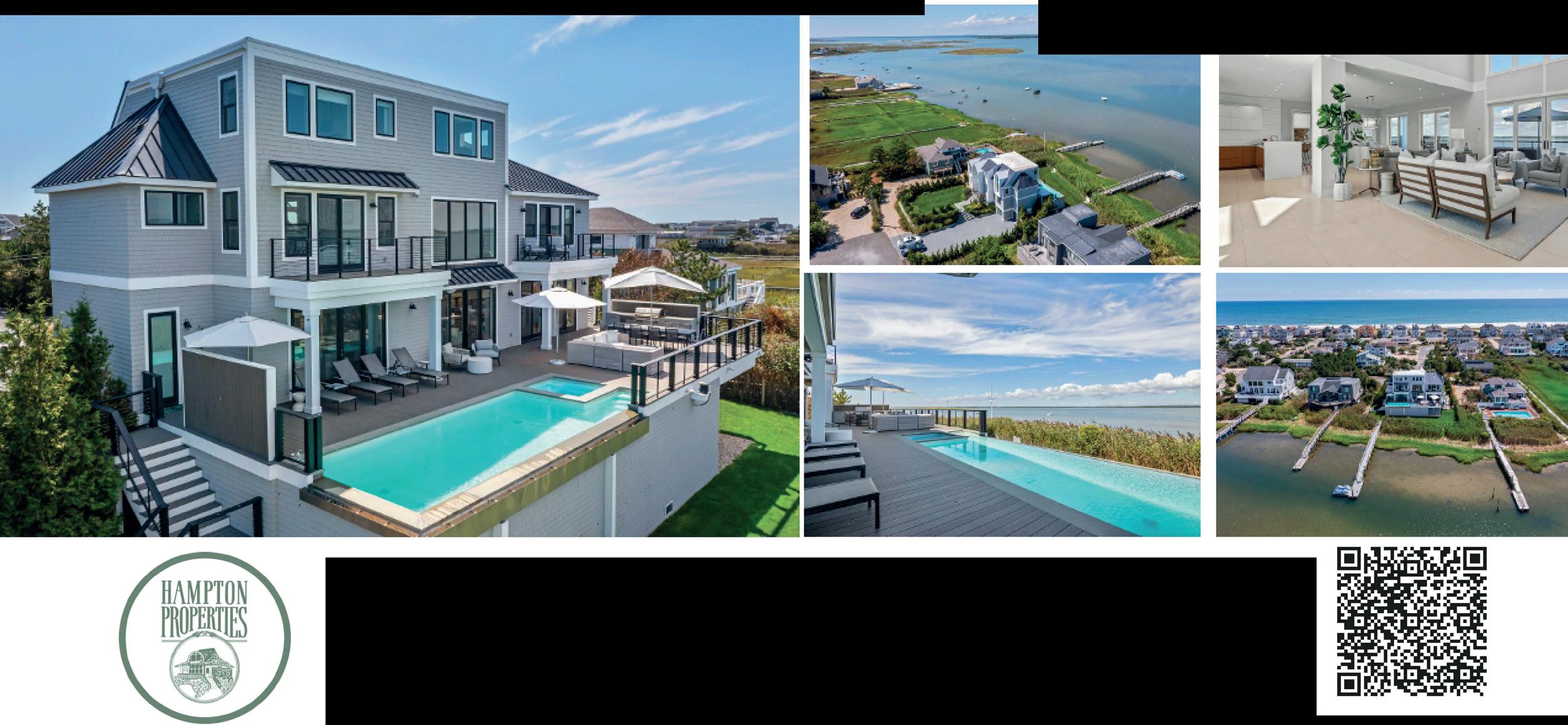 to showcase breathtaking sunsets and seamless indoor-outdoor living. Highlights include a chef’s kitchen with Viking appliances, a heated two-sided infinity-edge pool, rooftop deck with stainless steel outdoor kitchen, jacuzzi spa, gas fire pit, and a private staircase leading directly to a secluded stretch of Shinnecock Bay.